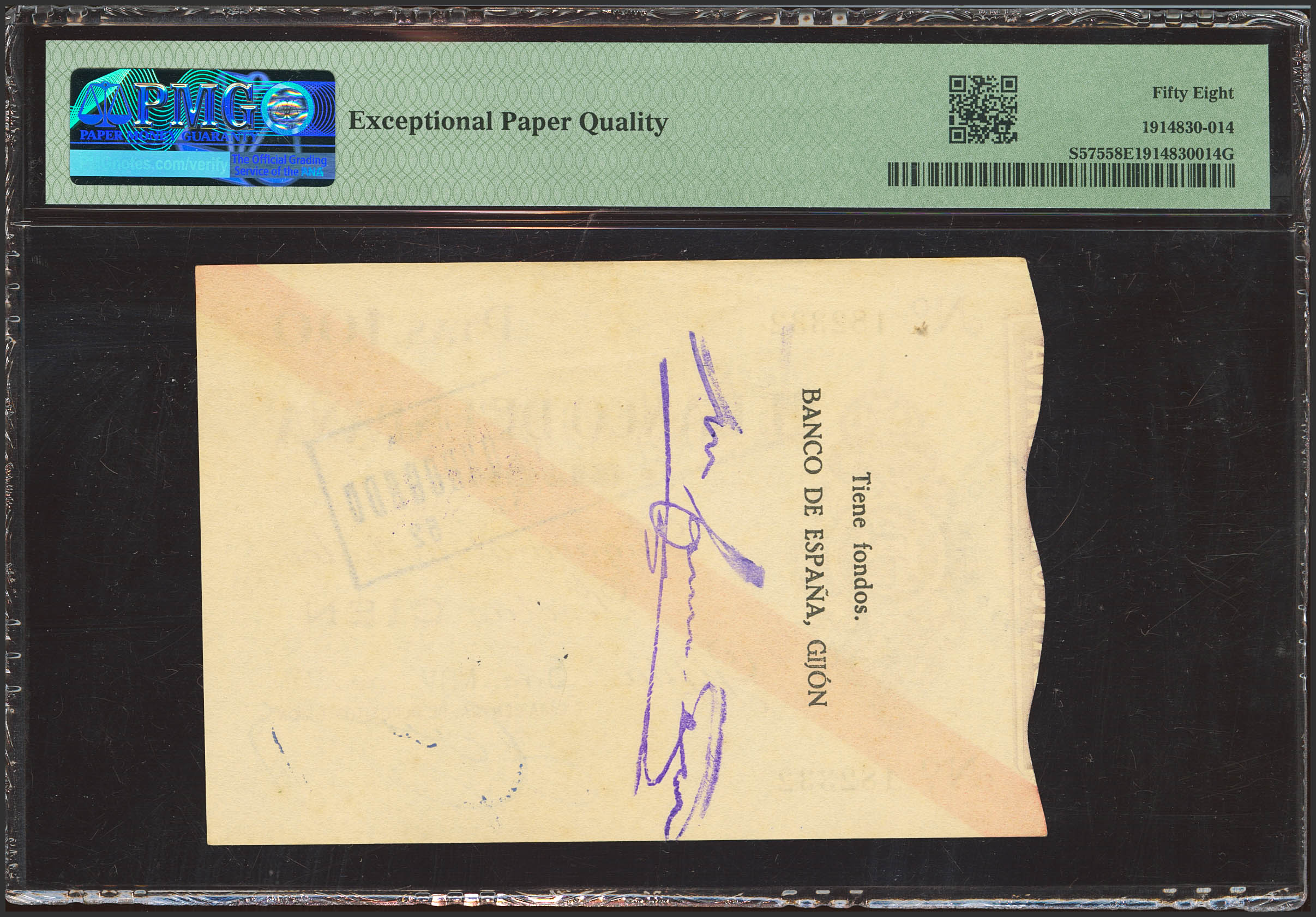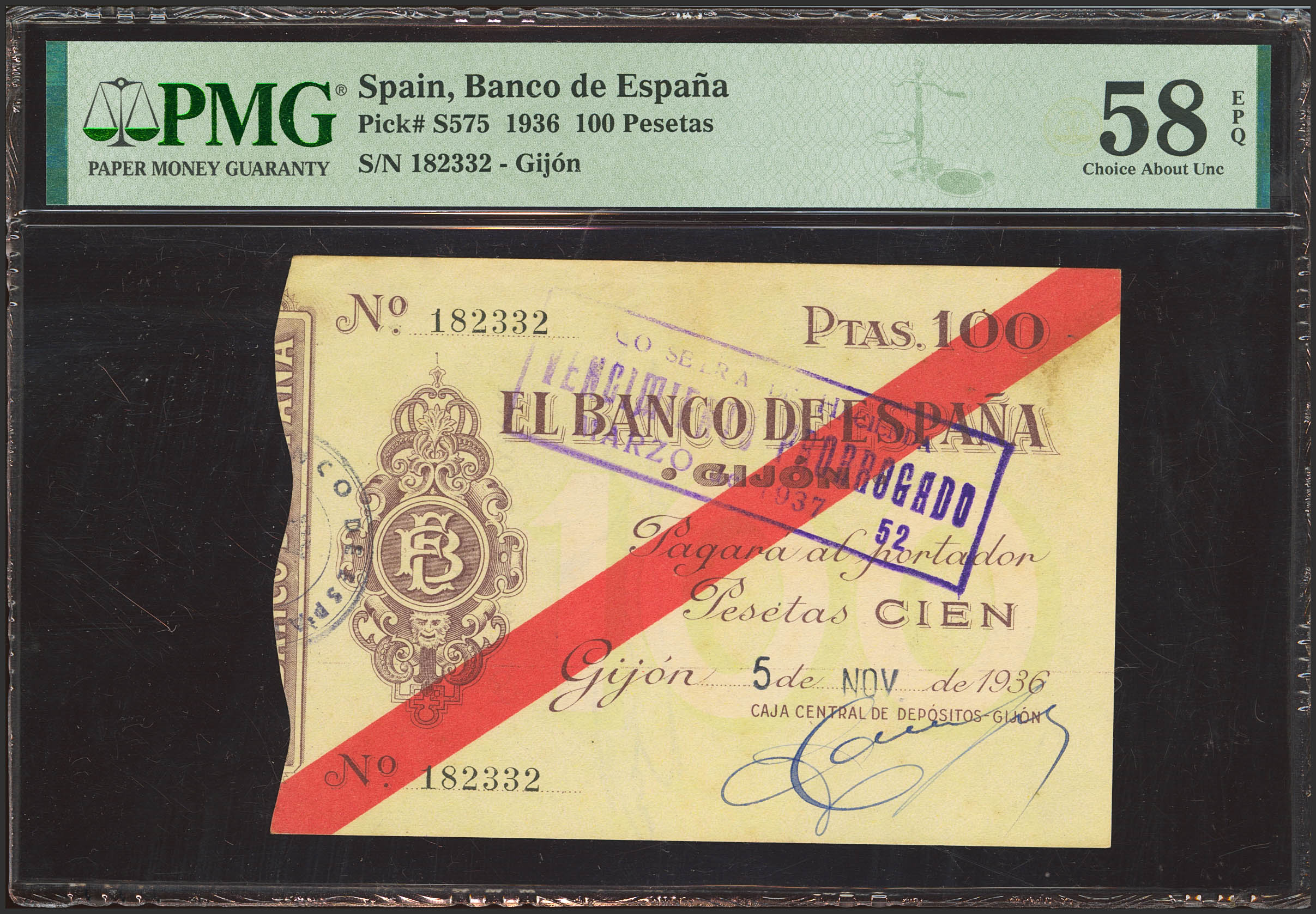 100 Pesetas. 1936. Sucursal de Gijón. (Edifil 2021: 384, Pick: S575). Raro en esta calidad, apresto original. EBC+++. Encapsulado PMG58EPQ. (para hacernos idea de la rareza, a fecha 1 de Abril de 2025, este billete es el único calificado con EPQ en PMG).