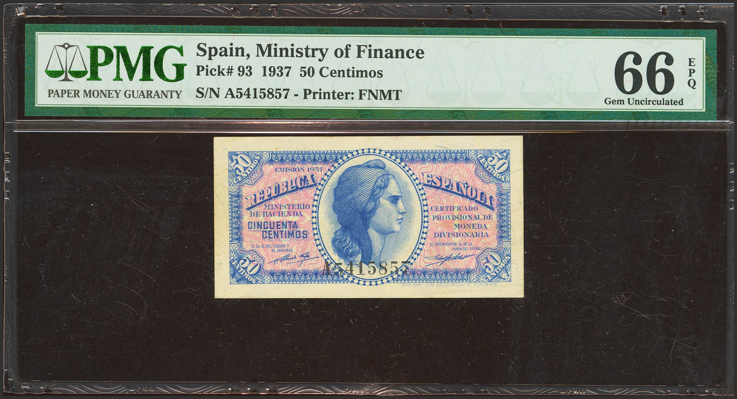 50 Céntimos. 1937. Serie A. (Edifil 2023: 391, Pick: 93). Apresto original. SC. Encapsulado PMG66EPQ.