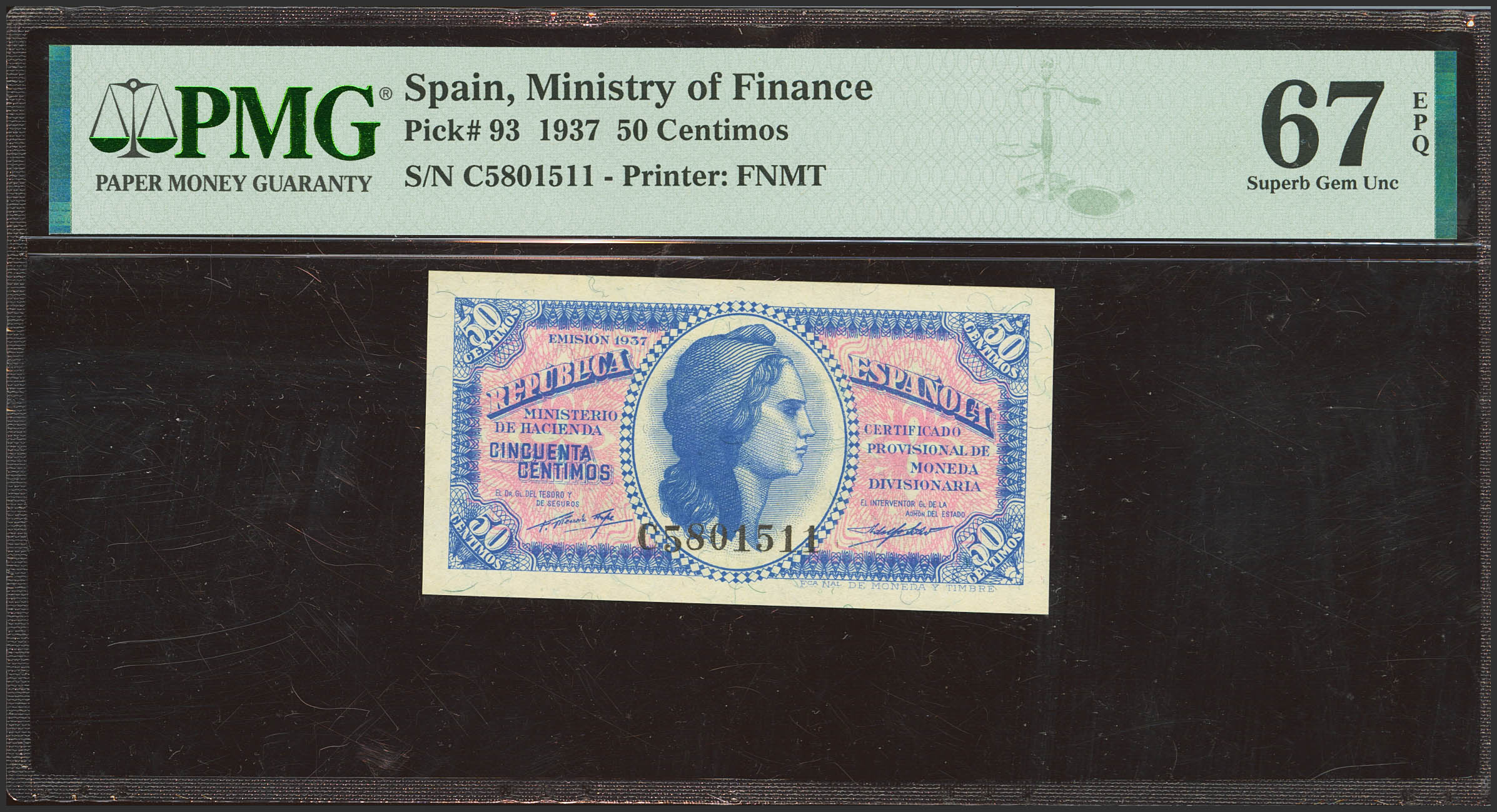 50 Céntimos. 1937. Ministerio de Hacienda. Serie C, última serie emitida. (Edifil 2023: 391a, Pick: 93). Inusual en esta excepcional conservación, apresto original. SC. Encapsulado PMG67EPQ.
