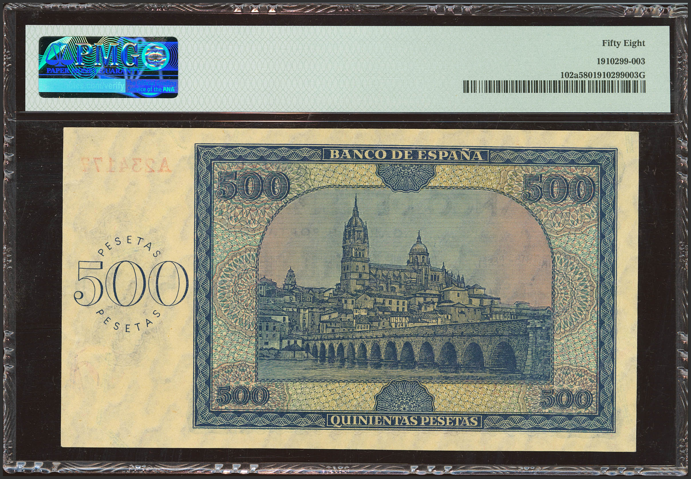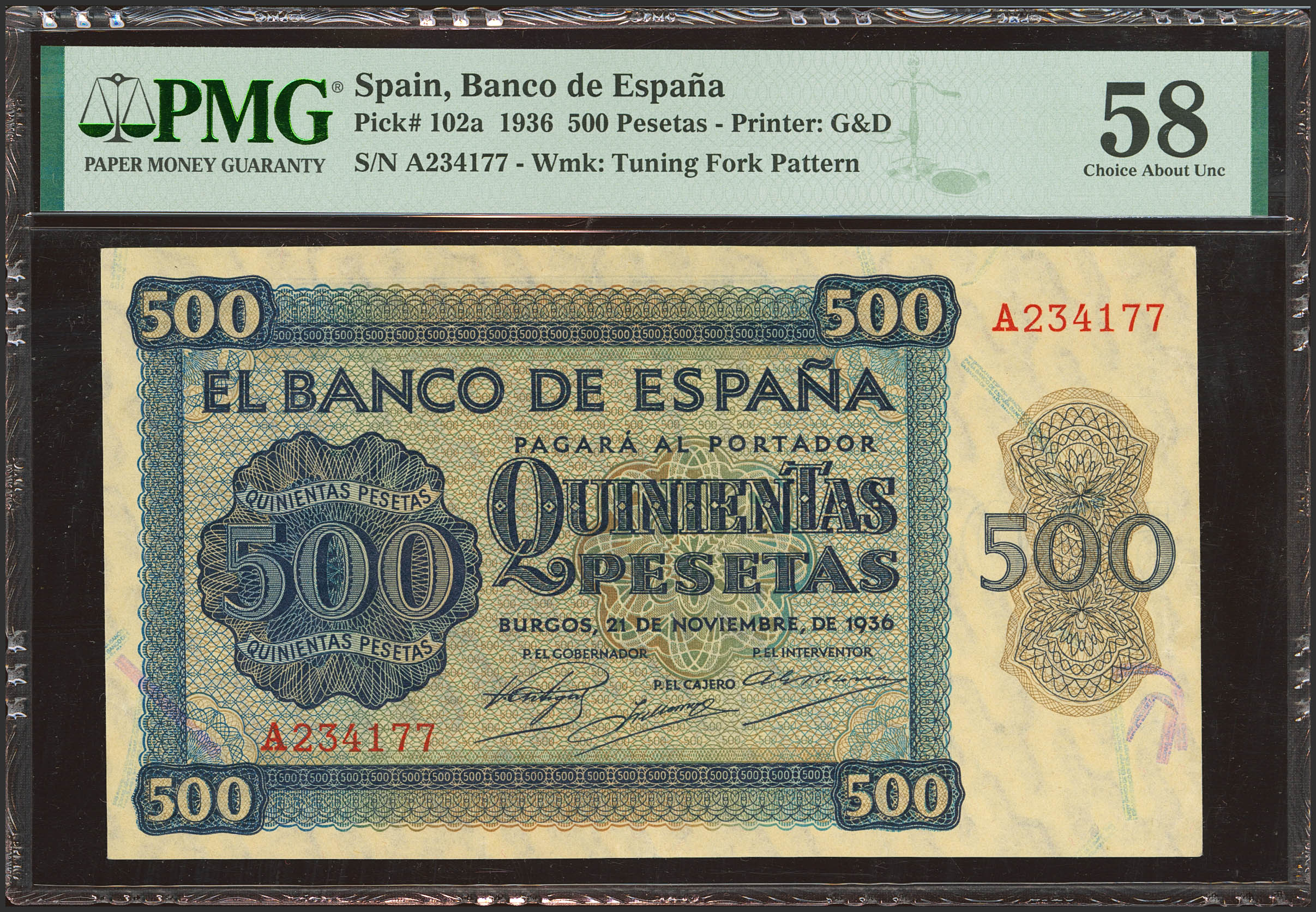 500 Pesetas. 21 de Noviembre de 1936. Serie A. (Edifil 2023: 422, Pick: 102a). Inusual. EBC++. Encapsulado PMG58.