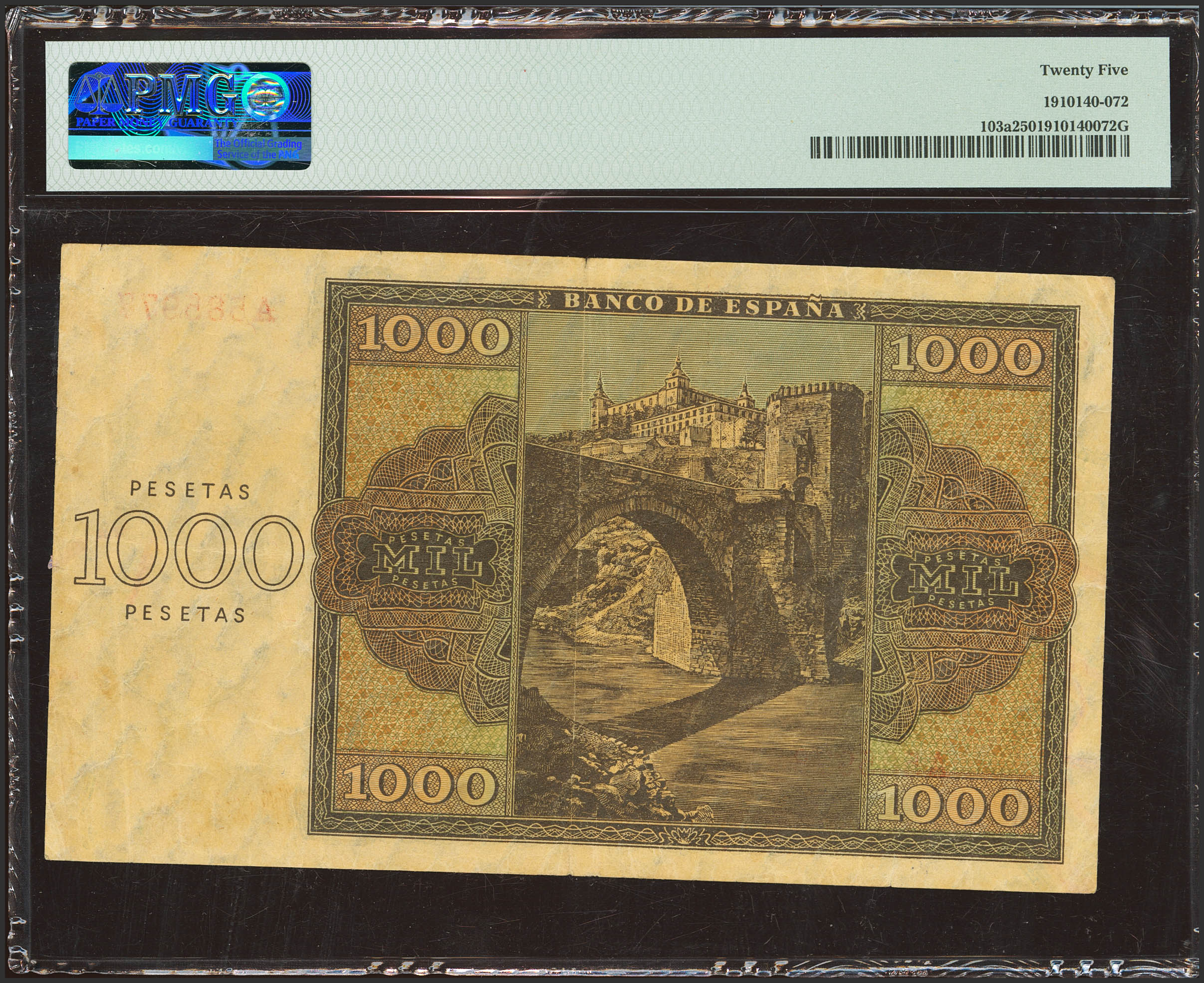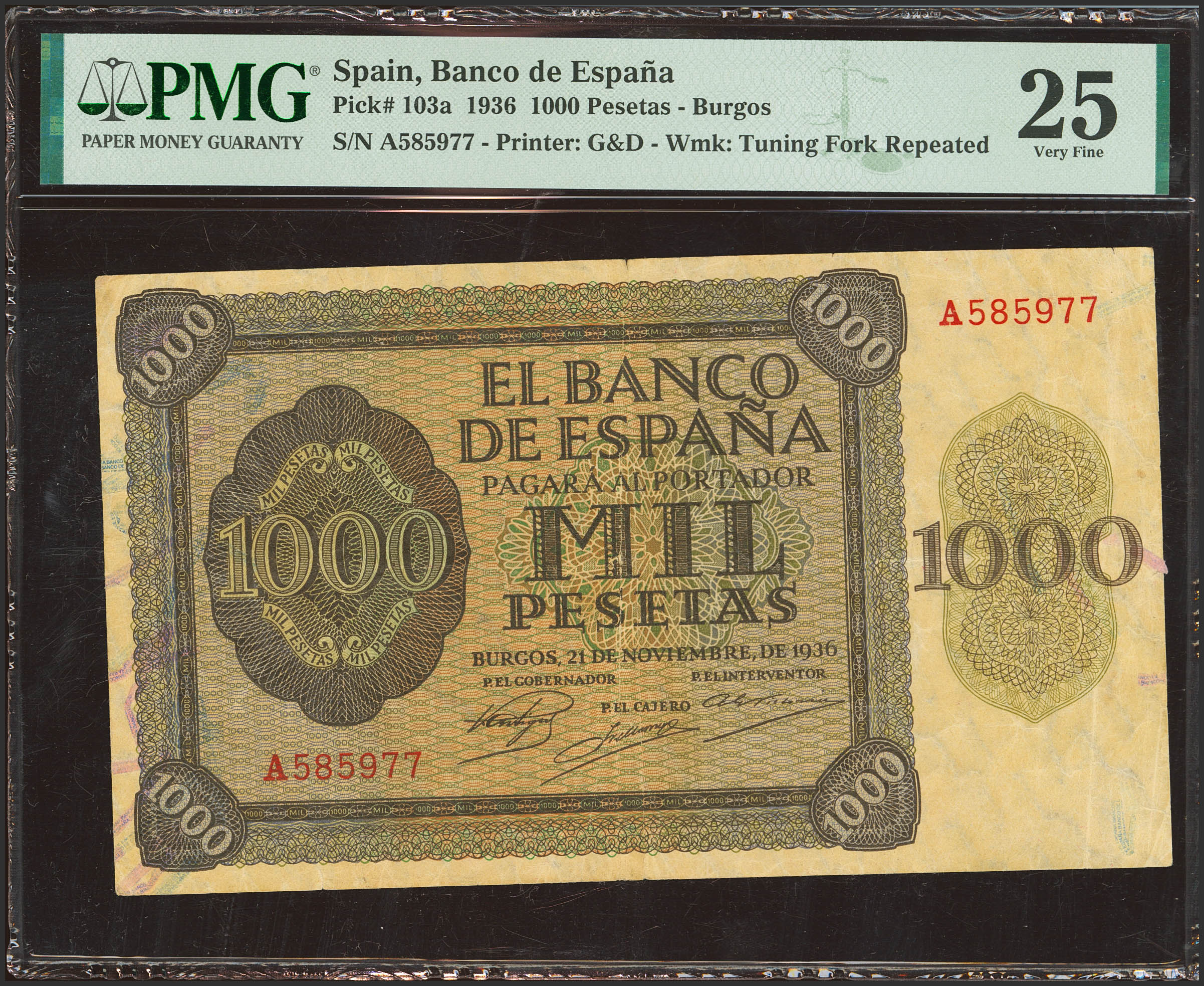 1000 Pesetas. 21 de Noviembre de 1936. Serie A. (Edifil 2023: 423, Pick: 103a). MBC+. Encapsulado PMG25.