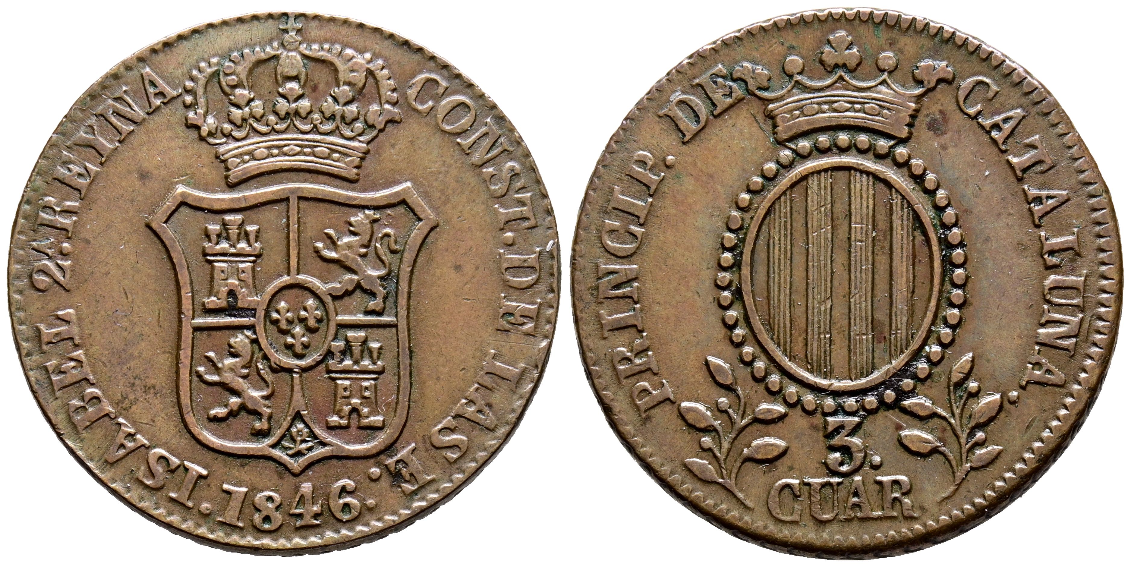ISABEL II (1833-1868). 3 Cuartos. (Ae. 6,81g/26mm). 1846. Barcelona. (Cal-2019-13). MBC+.