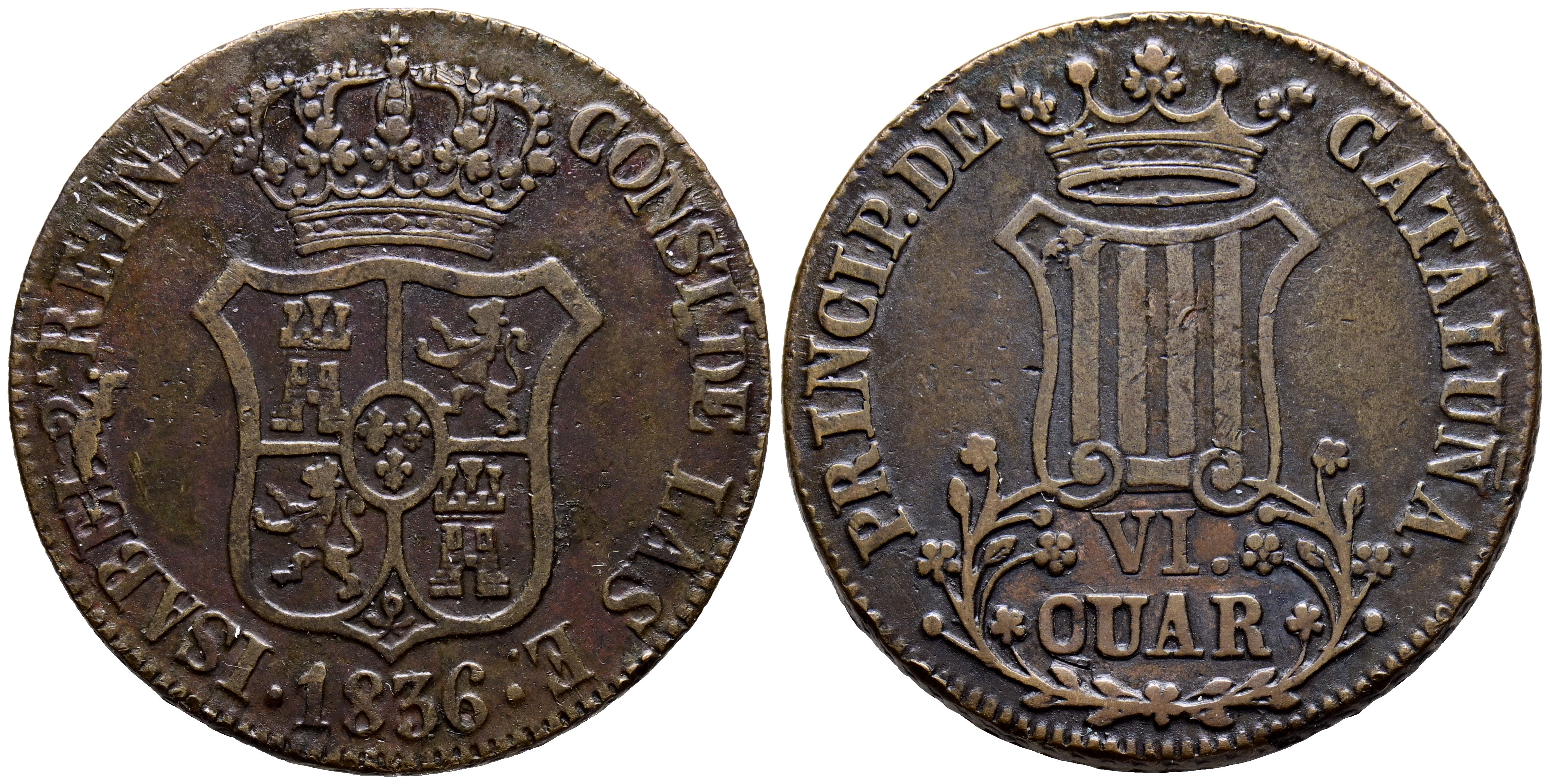 ISABEL II (1833-1868). 6 Cuartos. (Ae. 13,54g/33mm). 1836. Barcelona. (Cal-2019-no cita). MBC. Excepcional e inédita pieza que alberga dos variantes en una misma moneda que hasta la fecha sólo habíamos visto por separado: "RETNA" en leyenda del anverso (Cal-2019-16) y "VI QUAR" como marca de valor en reverso (Cal-2019-14). Interesantísimo ejemplar para cualquier coleccionista de este periodo ya que entendemos que se trata del único ejemplar conocido.