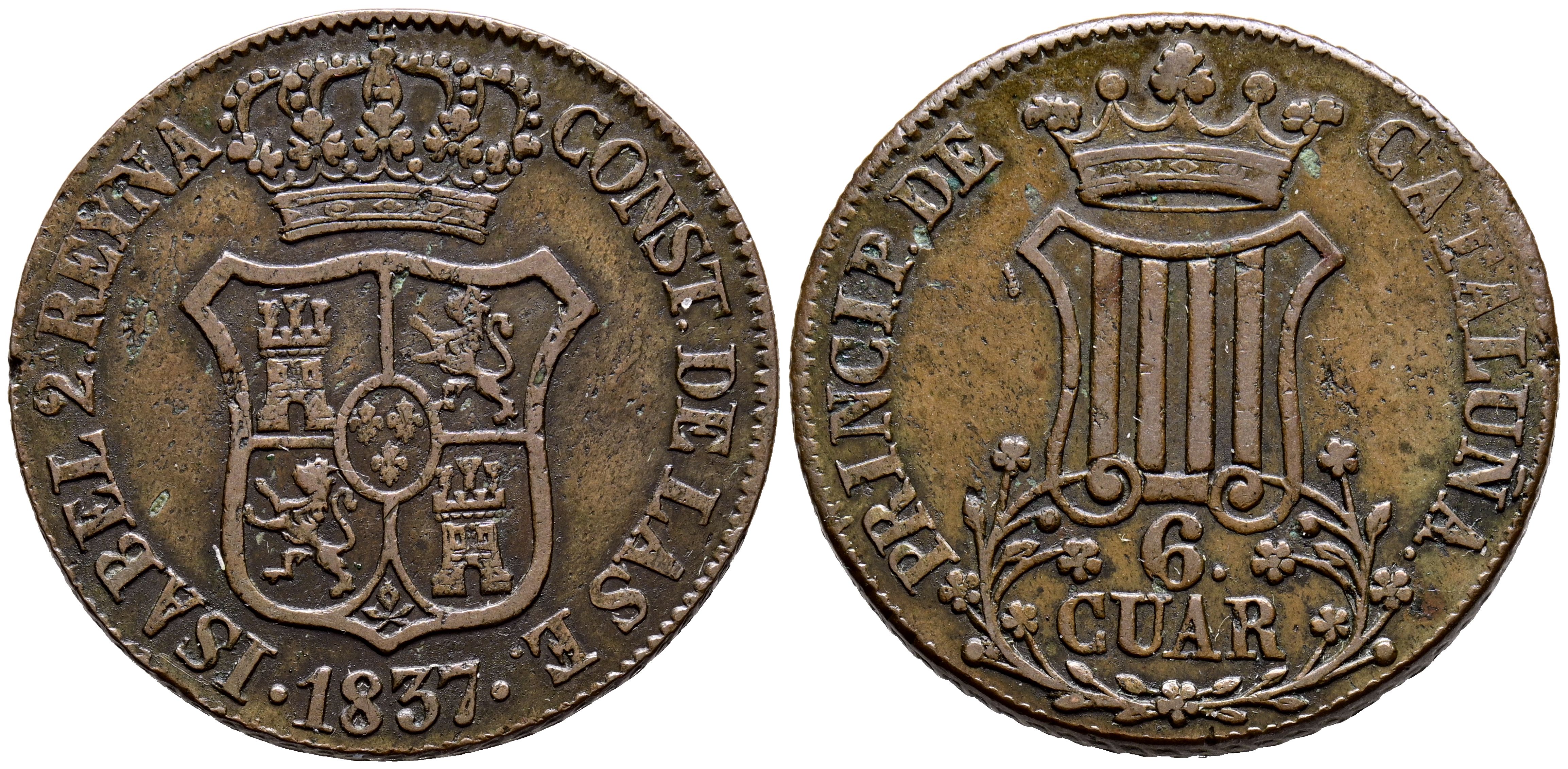 ISABEL II (1833-1868). 6 Cuartos. (Ae. 14,02g/33mm). 1837. Barcelona. (Cal-2019-17). MBC.