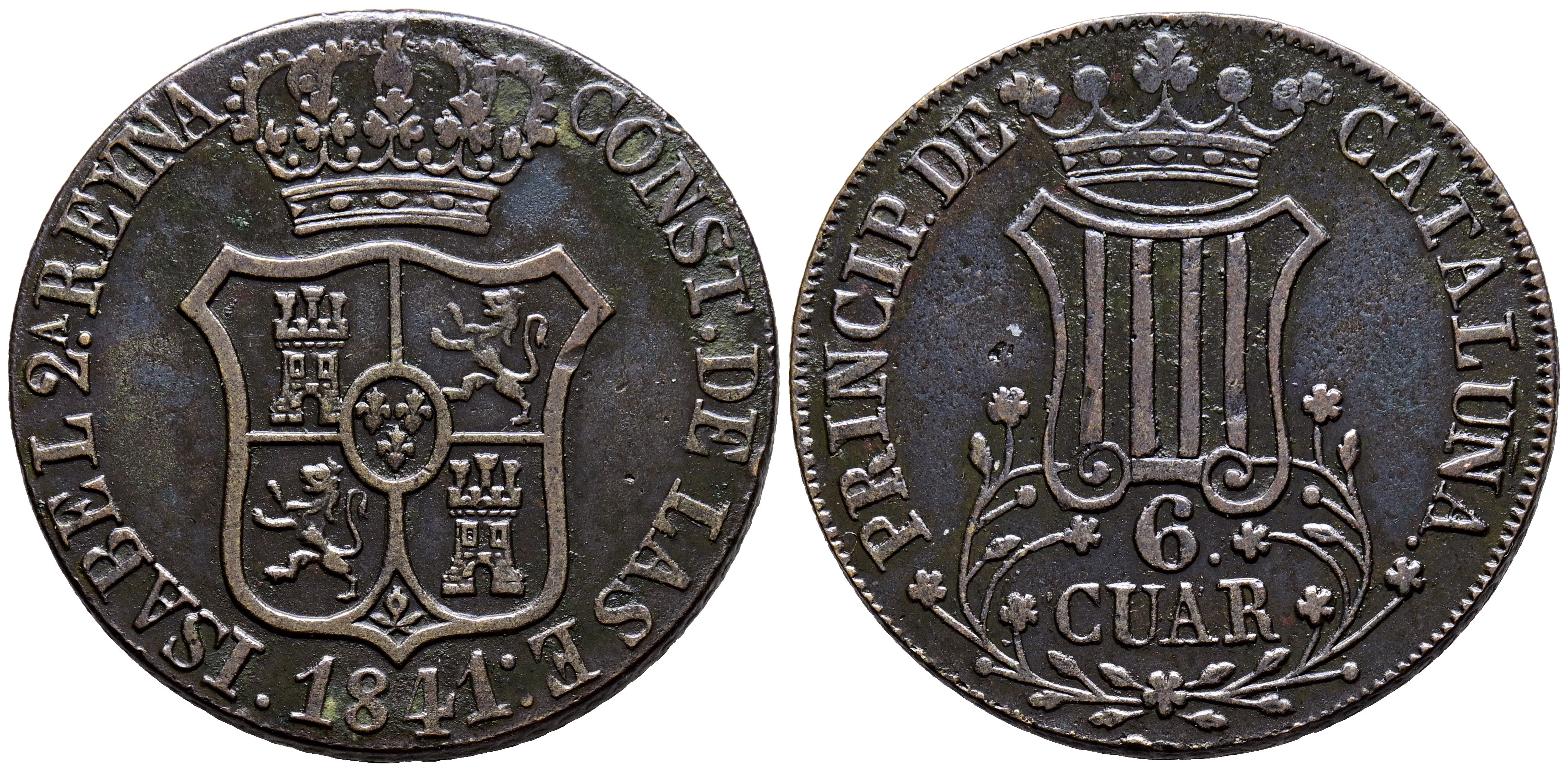 ISABEL II (1833-1868). 6 Cuartos. (Ae. 12,79g/33mm). 1841. Barcelona. (Cal-2019-22). MBC+.