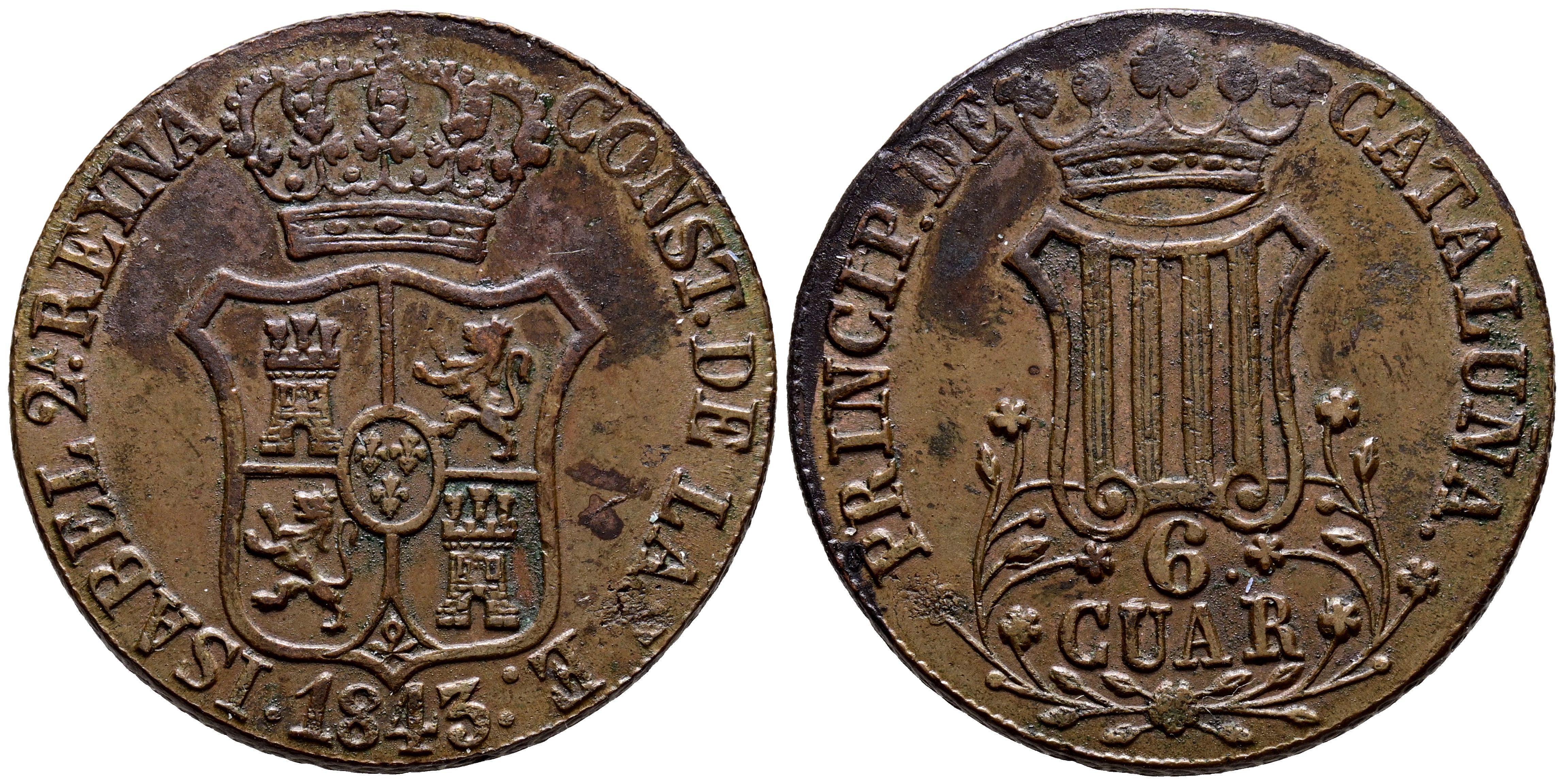 ISABEL II (1833-1868). 6 Cuartos. (Ae. 13,92g/33mm). 1843. Barcelona. (Cal-2019-25). EBC-.