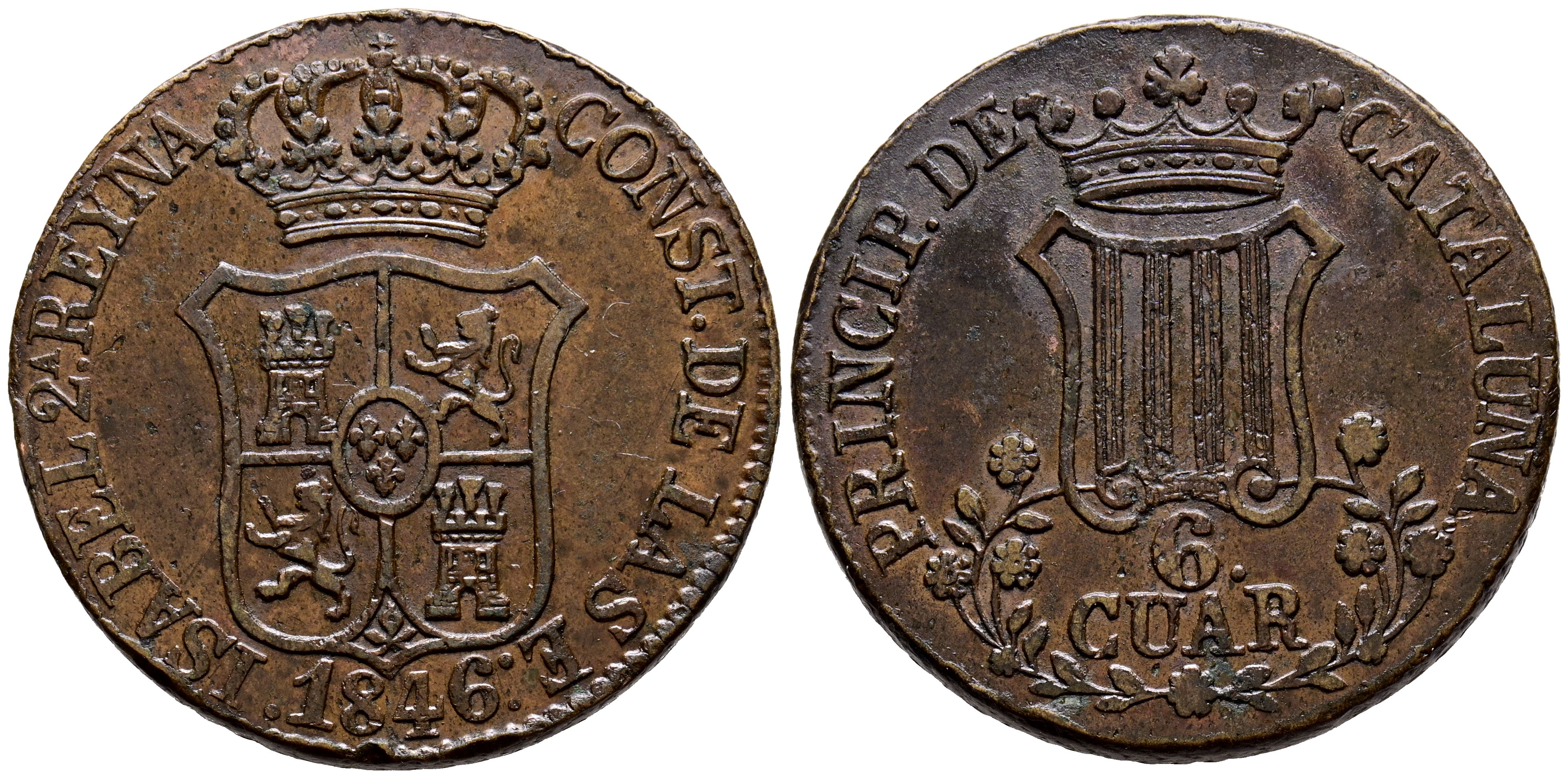 ISABEL II (1833-1868). 6 Cuartos. (Ae. 14,03g/33mm). 1846. Barcelona. (Cal-2019-31). Flor de 7 pétalos. MBC+.