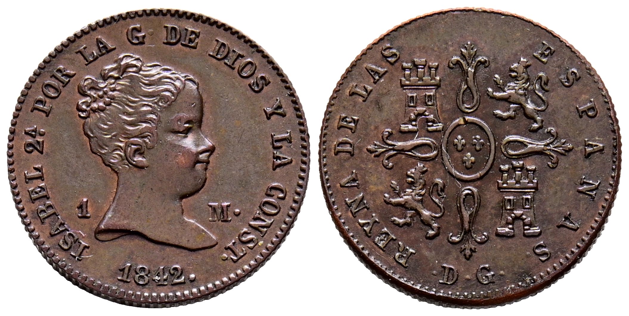 ISABEL II (1833-1868). 1 Maravedí. (Ae. 1,33g/ 15mm). 1842. Madrid DG (Departamento de Grabado). (Cal-2019-34). EBC+. Preciosa pátina. Escaso y más en esta excelente calidad.