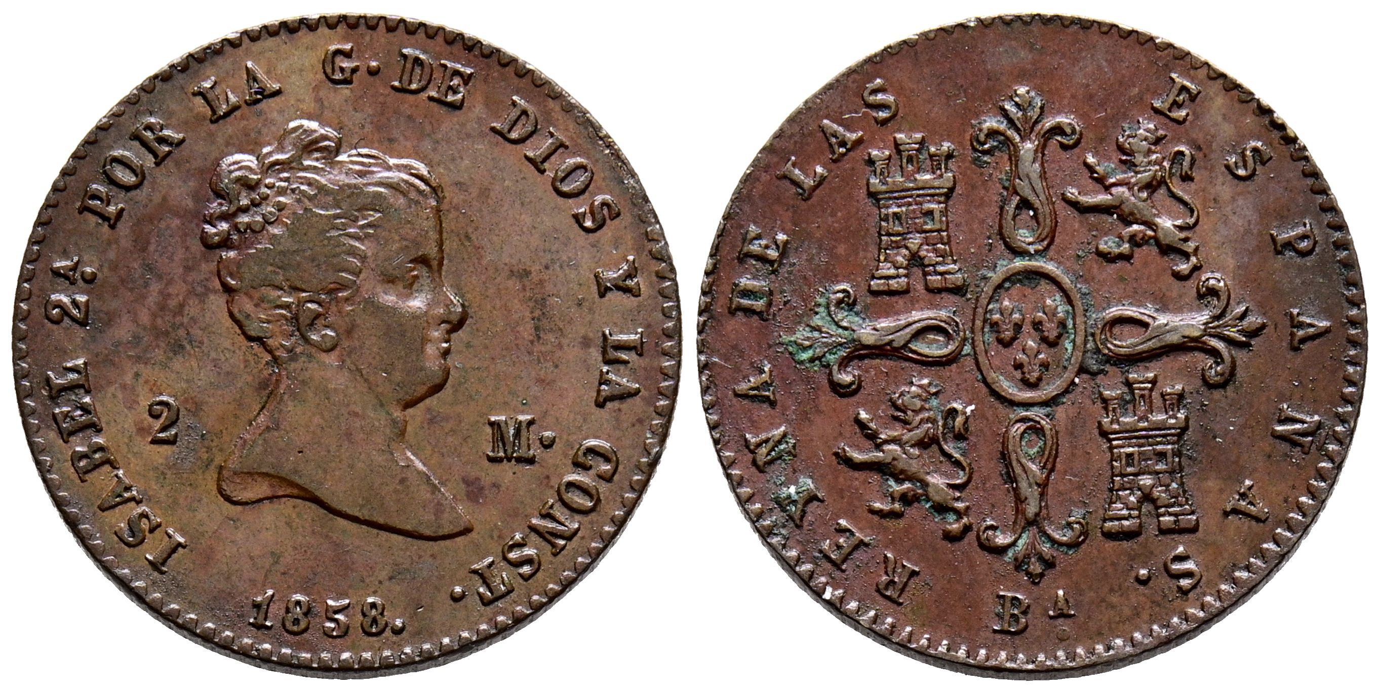 ISABEL II (1833-1868). 2 Maravedís. (Ae. 2,33g/19mm). 1858. Barcelona. (Cal-2019-37). Único año de acuñación de este módulo en Barcelona. EBC-. Puntos de óxido en reverso. Escasa.