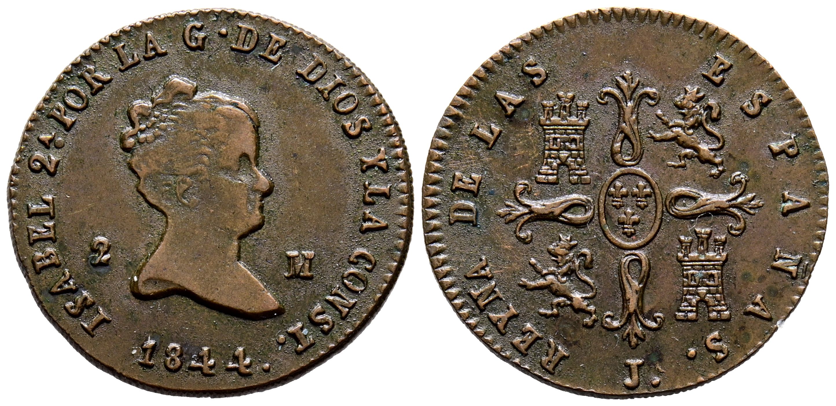 ISABEL II (1833-1868). 2 Maravedís. (Ae. 2,57g/19mm). 1844. Jubia Jª. (Cal-2019-45). MBC+/EBC-. Escasa.