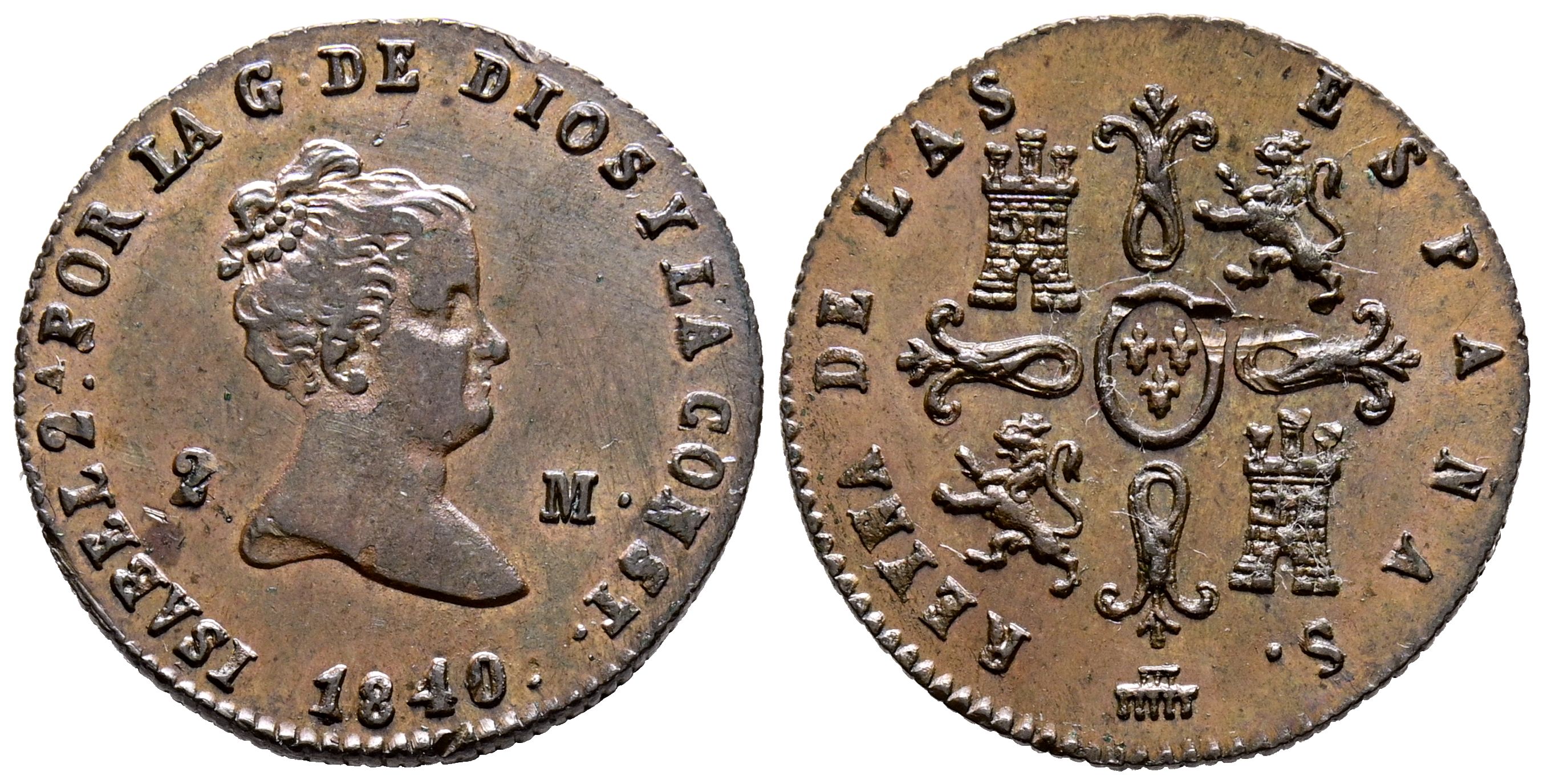 ISABEL II (1833-1868). 2 Maravedís. (Ae. 2,18g/19mm). 1840. Segovia. (Cal-2019-51). EBC. Golpe en reverso