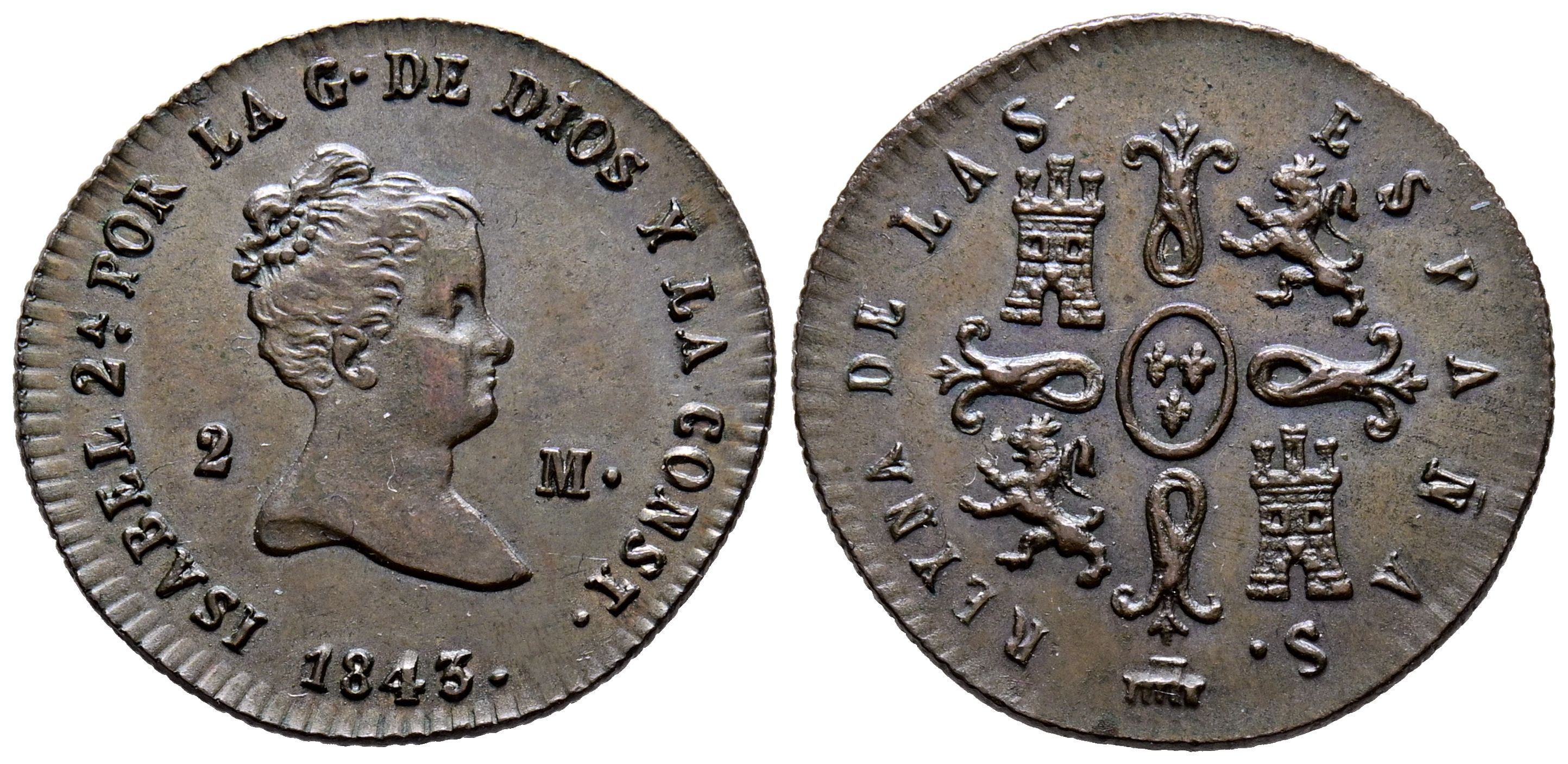 ISABEL II (1833-1868). 2 Maravedís. (Ae. 2,37g/19mm). 1843. Segovia. (Cal-2019-55). EBC+. Preciosa pátina.