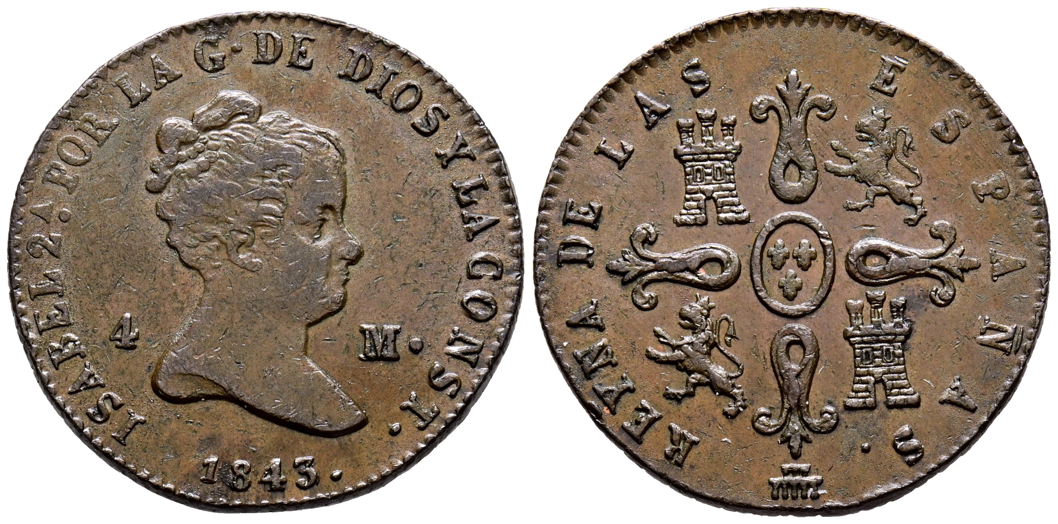 ISABEL II (1833-1868). 4 Maravedís. (Ae. 4,82g/24mm). 1843. Segovia. (Cal-2019-86). MBC+/EBC-.