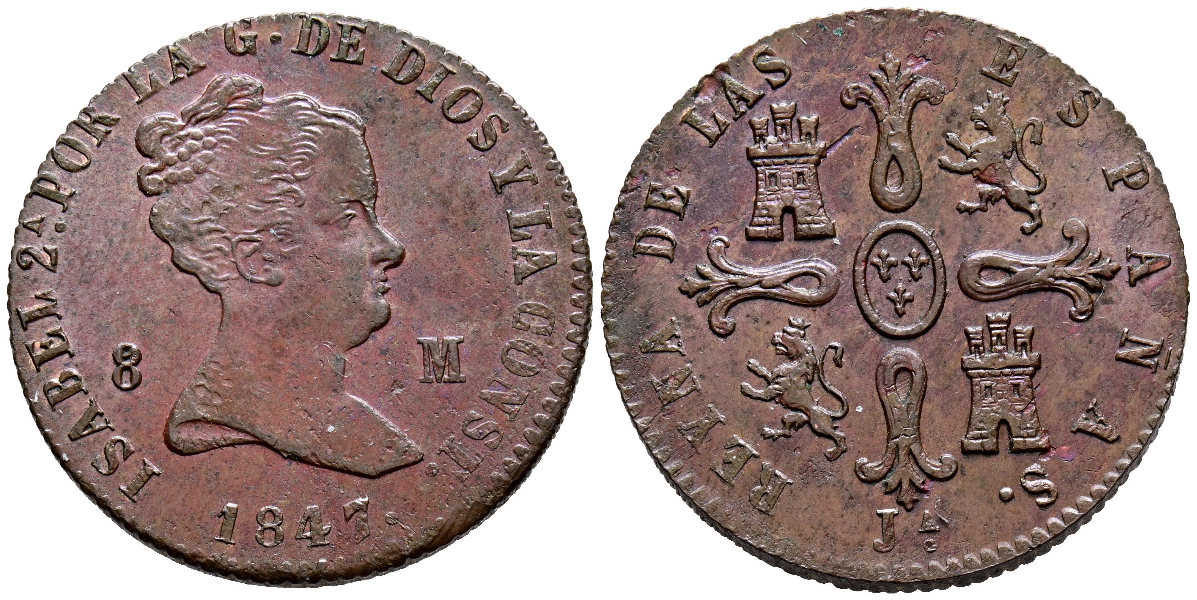 ISABEL II (1833-1868). 8 Maravedís. (Ae. 9,30g/29mm). 1847. Jubia. (Cal-2019-114). EBC. Pátina rojiza.