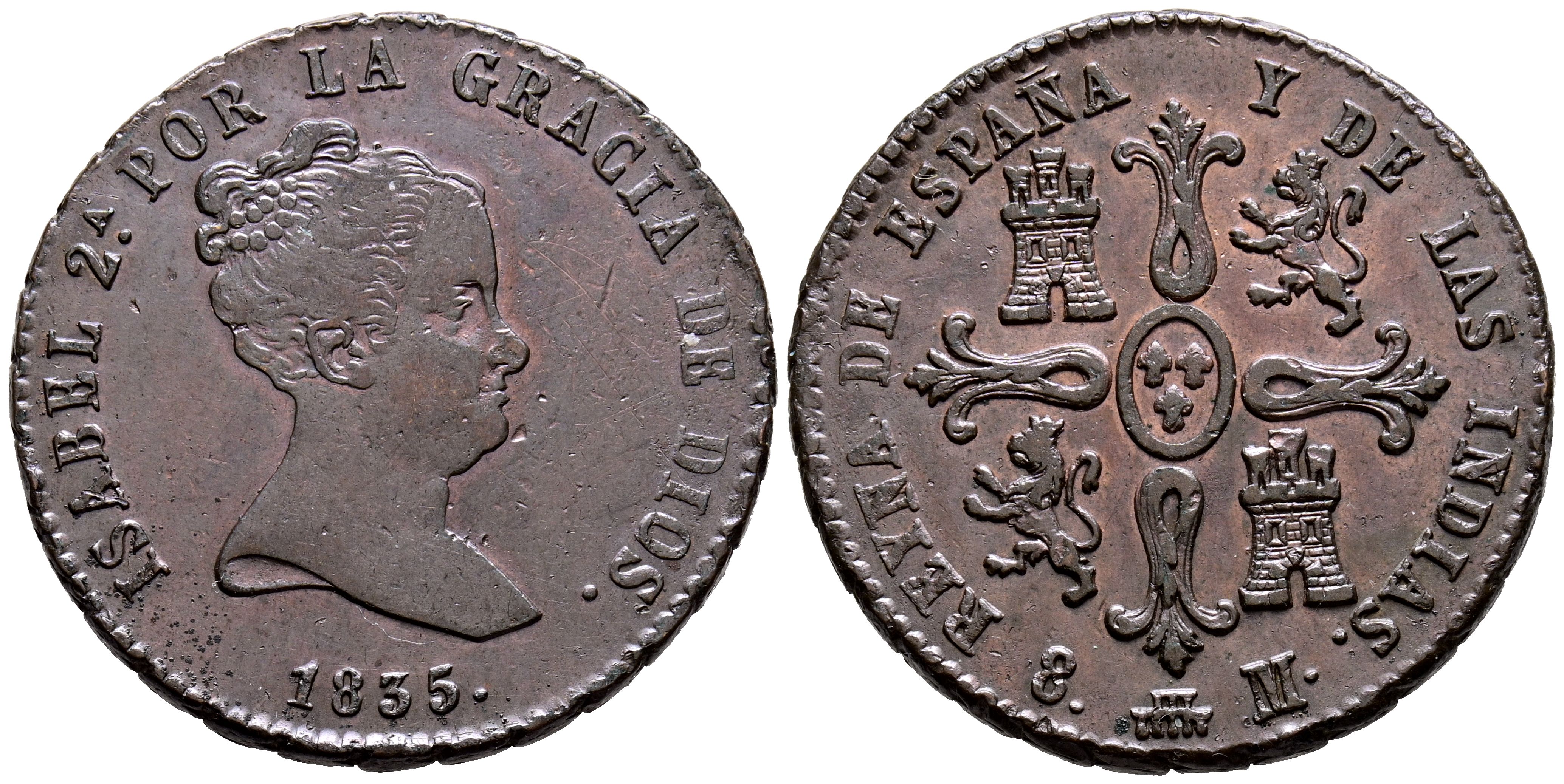 ISABEL II (1833-1868). 8 Maravedís. (Ae. 11,14g/29mm). 1835. Segovia. (Cal-2019-121). Valor en reverso. MBC+/EBC-. Preciosa pátina en reverso. Escasa.