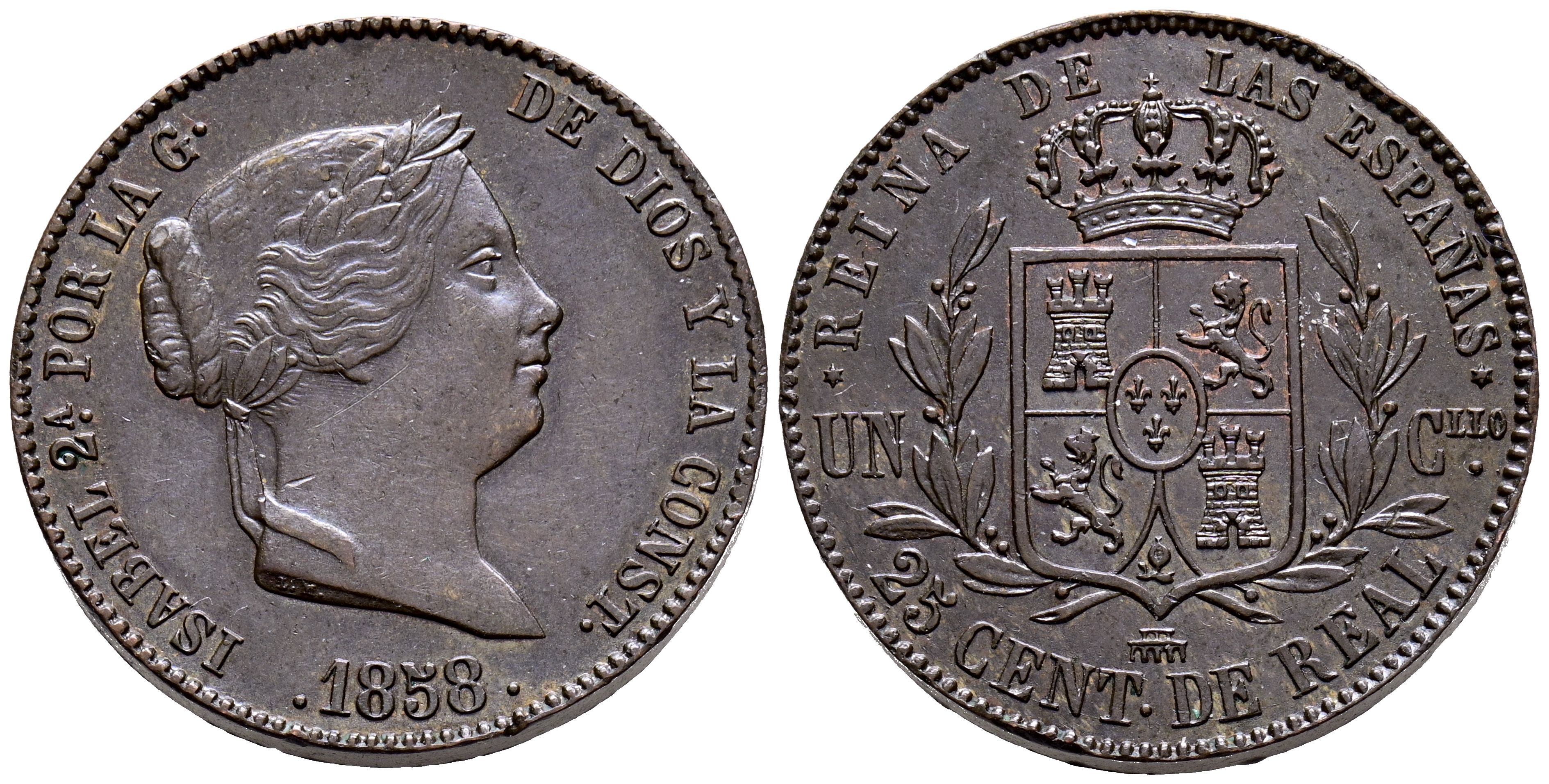 ISABEL II (1833-1868). 25 Céntimos de Real. (Ae. 8,66g/27mm). 1858. Segovia. (Cal-2019-191). SC-. Leves marquitas en anverso. Escasa así.