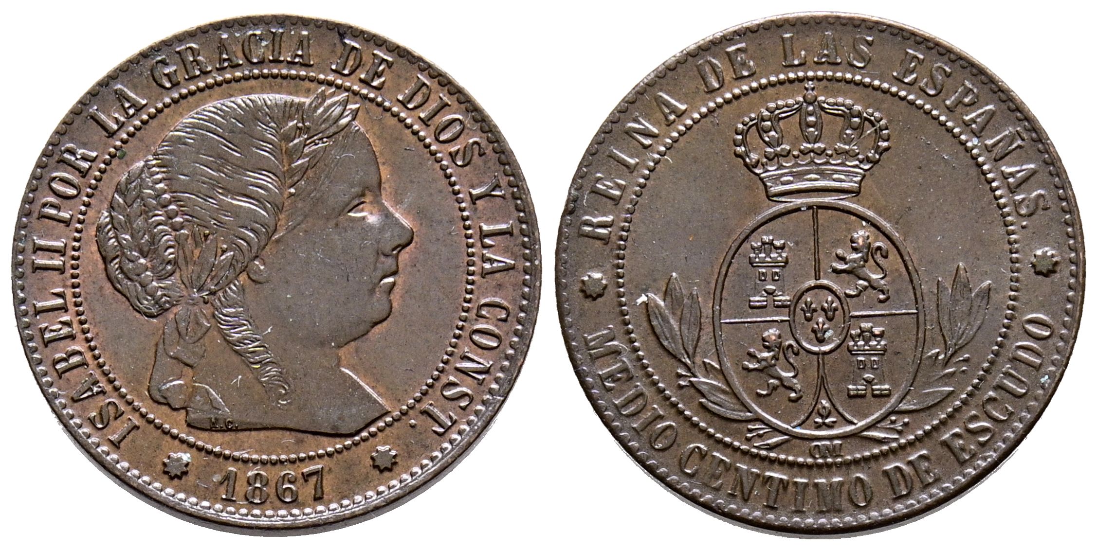 ISABEL II (1833-1868). 1/2 Céntimos de Escudo. (Ae. 1,25g/16mm). 1867. Barcelona OM. (Cal-2019-200). EBC+. Tono.