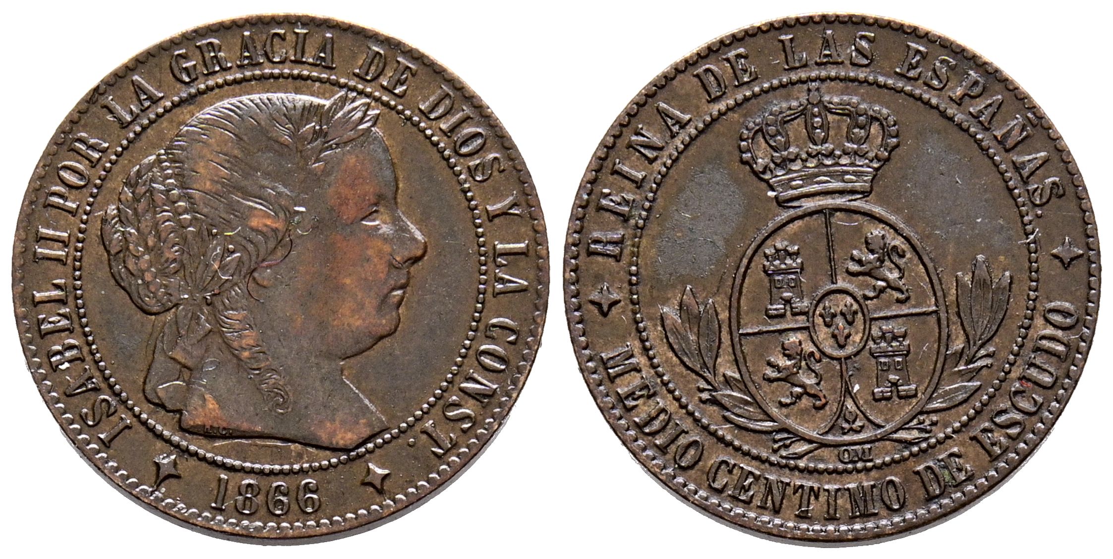 ISABEL II (1833-1868). 1/2 Céntimos de Escudo. (Ae. 1,26g/16mm). 1866. Jubia OM. (Cal-2019-202). EBC-.