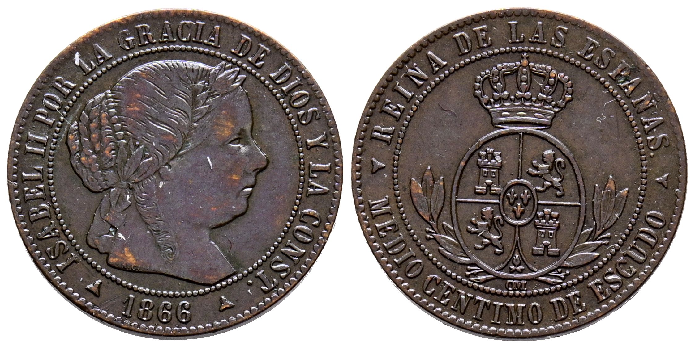 ISABEL II (1833-1868). 1/2 Céntimos de Escudo. (Ae. 1,21g/16mm). 1866. Segovia OM. (Cal-2019-208). MBC+.