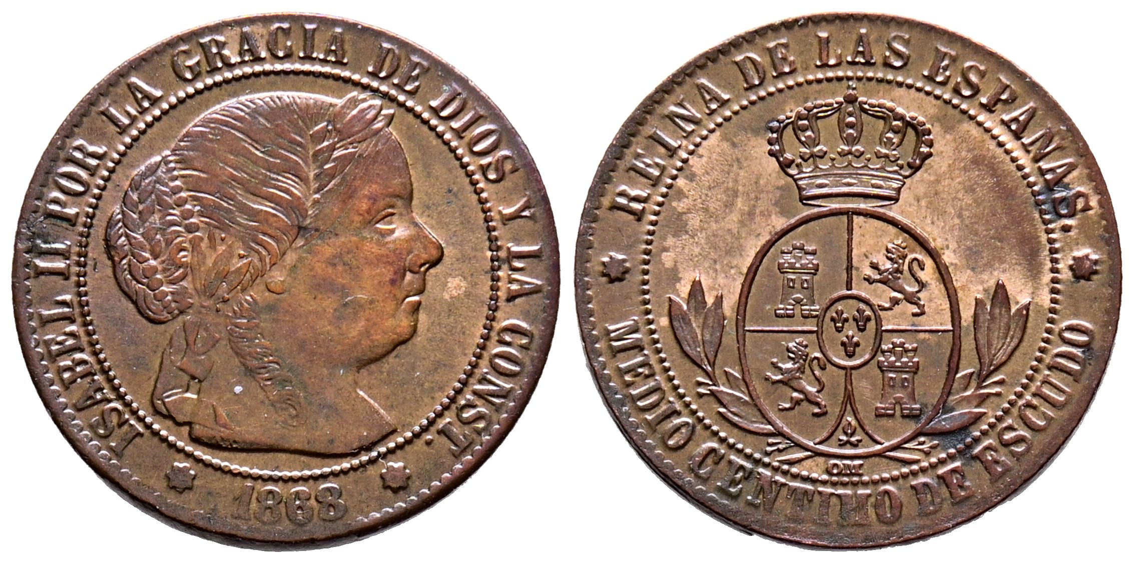 ISABEL II (1833-1868). 1/2 Céntimos de Escudo. (Ae. 1,20g/16mm). 1868. Sevilla OM. (Cal-2019-212). EBC-/EBC.