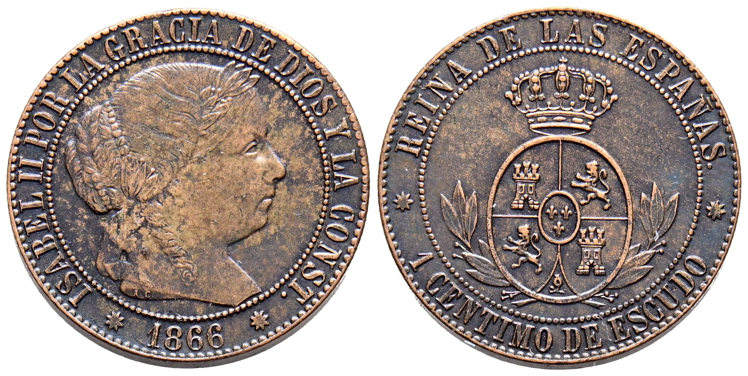 ISABEL II (1833-1868). 1 Céntimo de Escudo. (Ae. 2,47g/18mm). 1866. Barcelona. Sin OM. (Cal-2019-213). MBC+. Atractivo ejemplar.