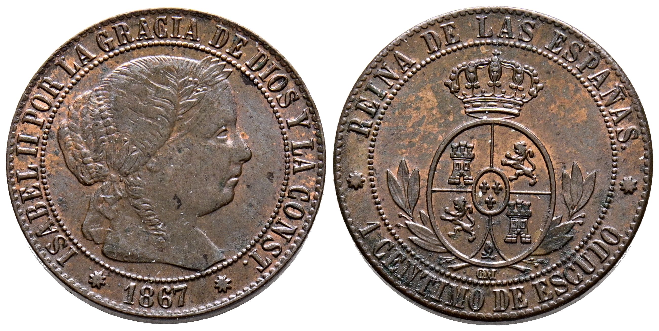 ISABEL II (1833-1868). 1 Céntimo de Escudo. (Ae. 2,57g/18mm). 1867. Barcelona OM. (Cal-2019-215). MBC+.
