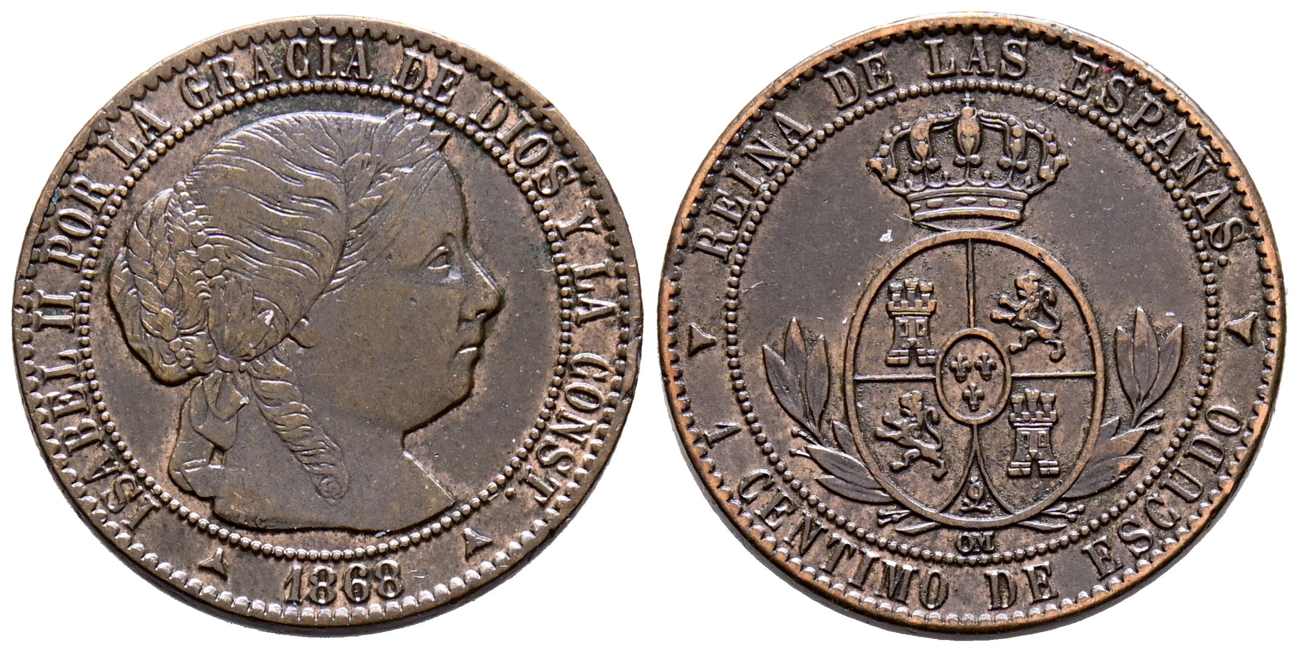 ISABEL II (1833-1868). 1 Céntimo de Escudo. (Ae. 2,52g/18mm). 1868. Segovia OM. (Cal-2019-227). MBC+.