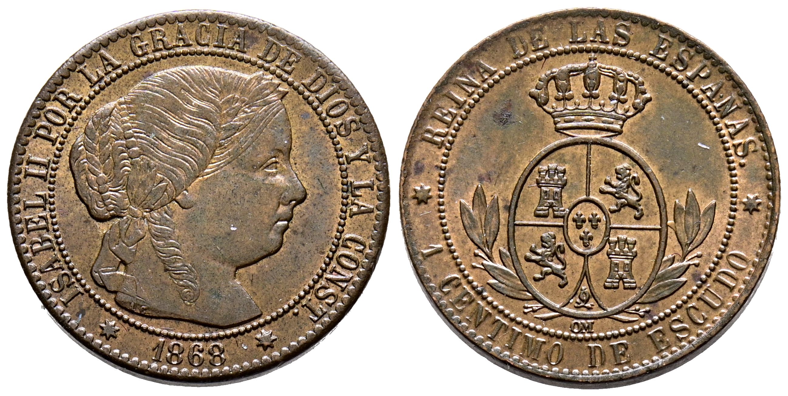 ISABEL II (1833-1868). 1 Céntimo de Escudo. (Ae. 2,57g/18mm). 1868. Sevilla OM. (Cal-2019-229). EBC.