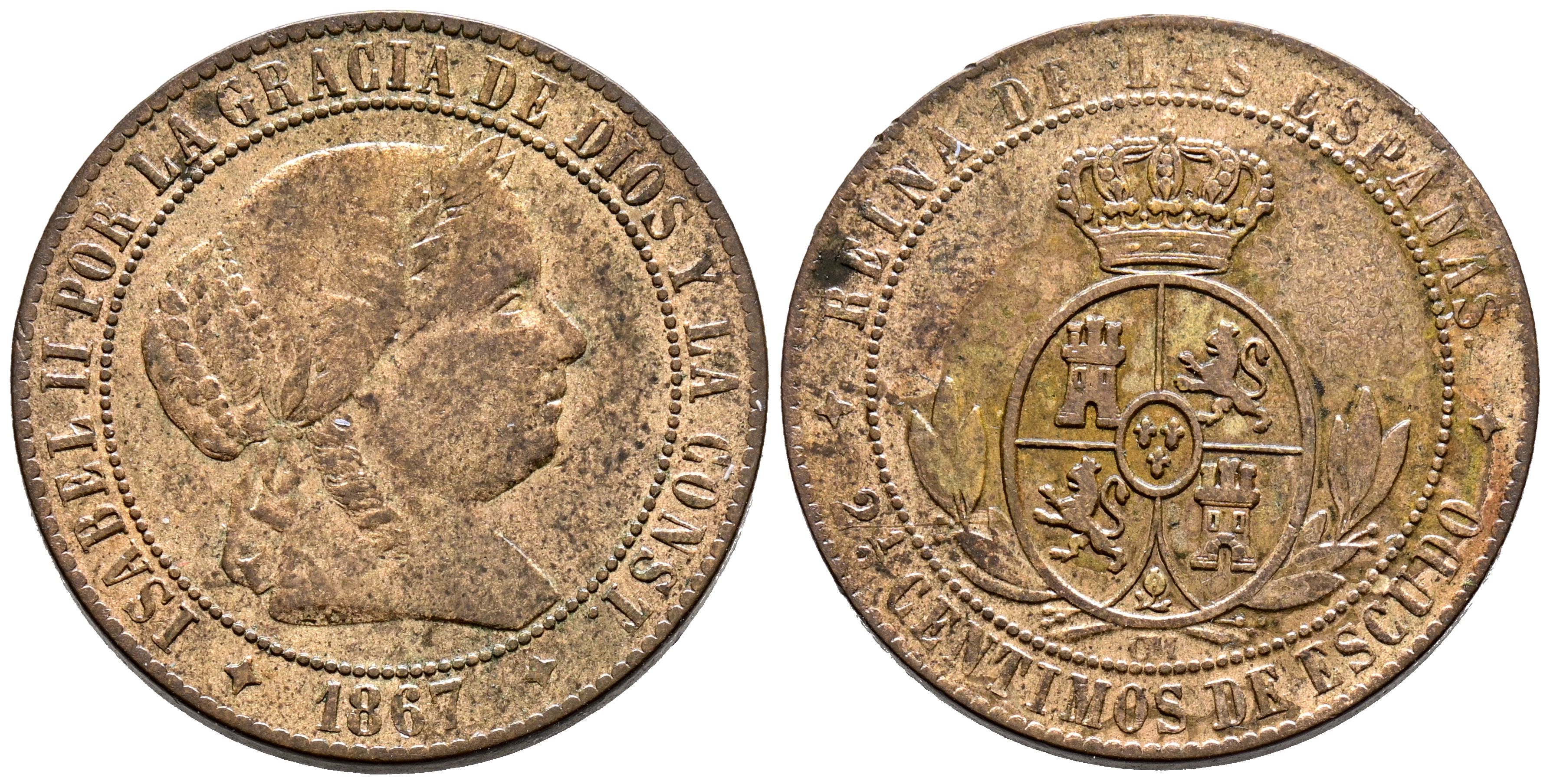 ISABEL II (1833-1868). 2 1/2 Céntimos de Escudo. (Ae. 6,14g/25mm). 1867. Jubia OM. (Cal-2019-236). MBC.