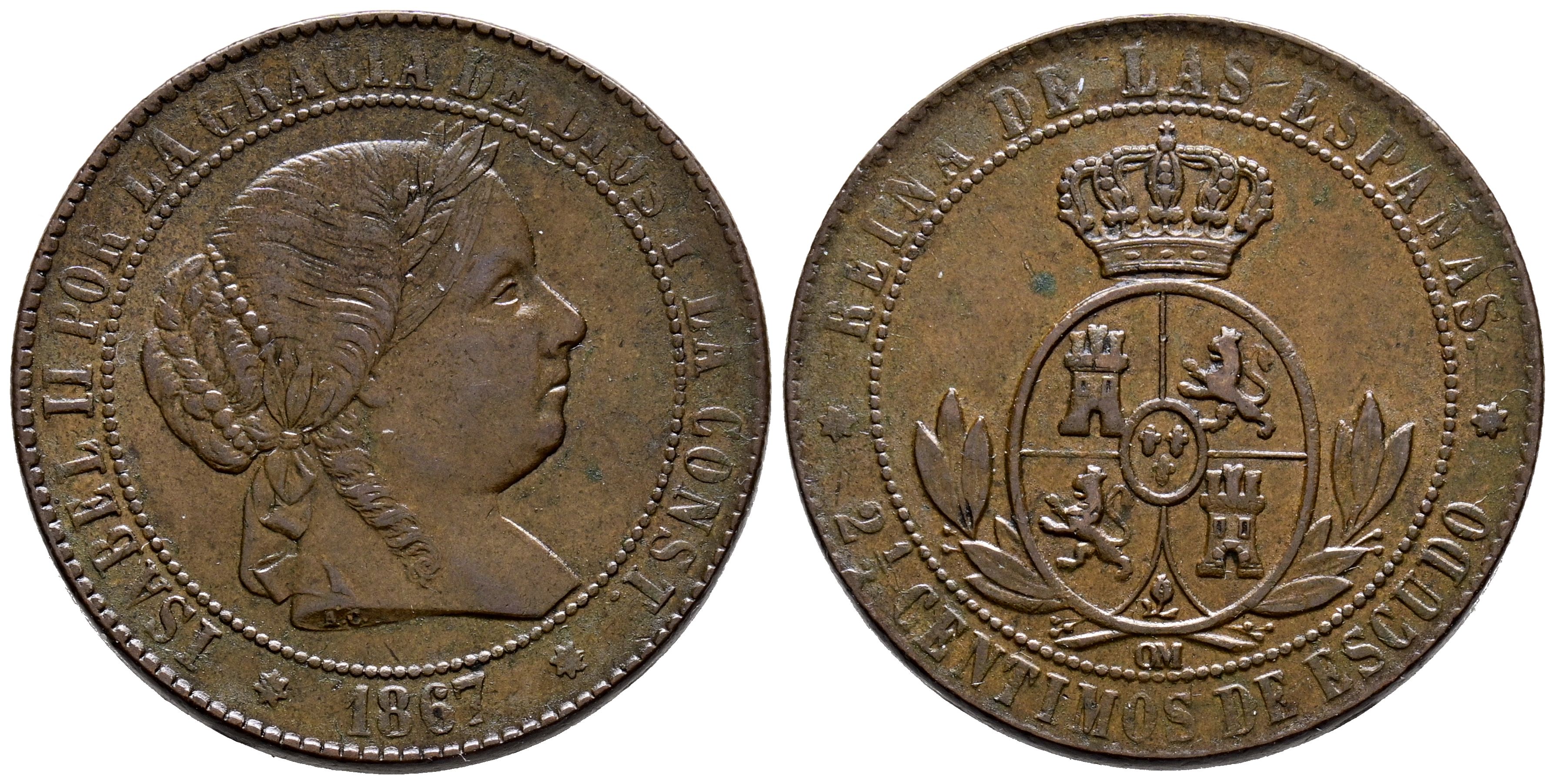 ISABEL II (1833-1868). 2 1/2 Céntimos de Escudo. (Ae. 6,23g/25mm). 1867. Sevilla OM. (Cal-2019-242). MBC+. Escasa.