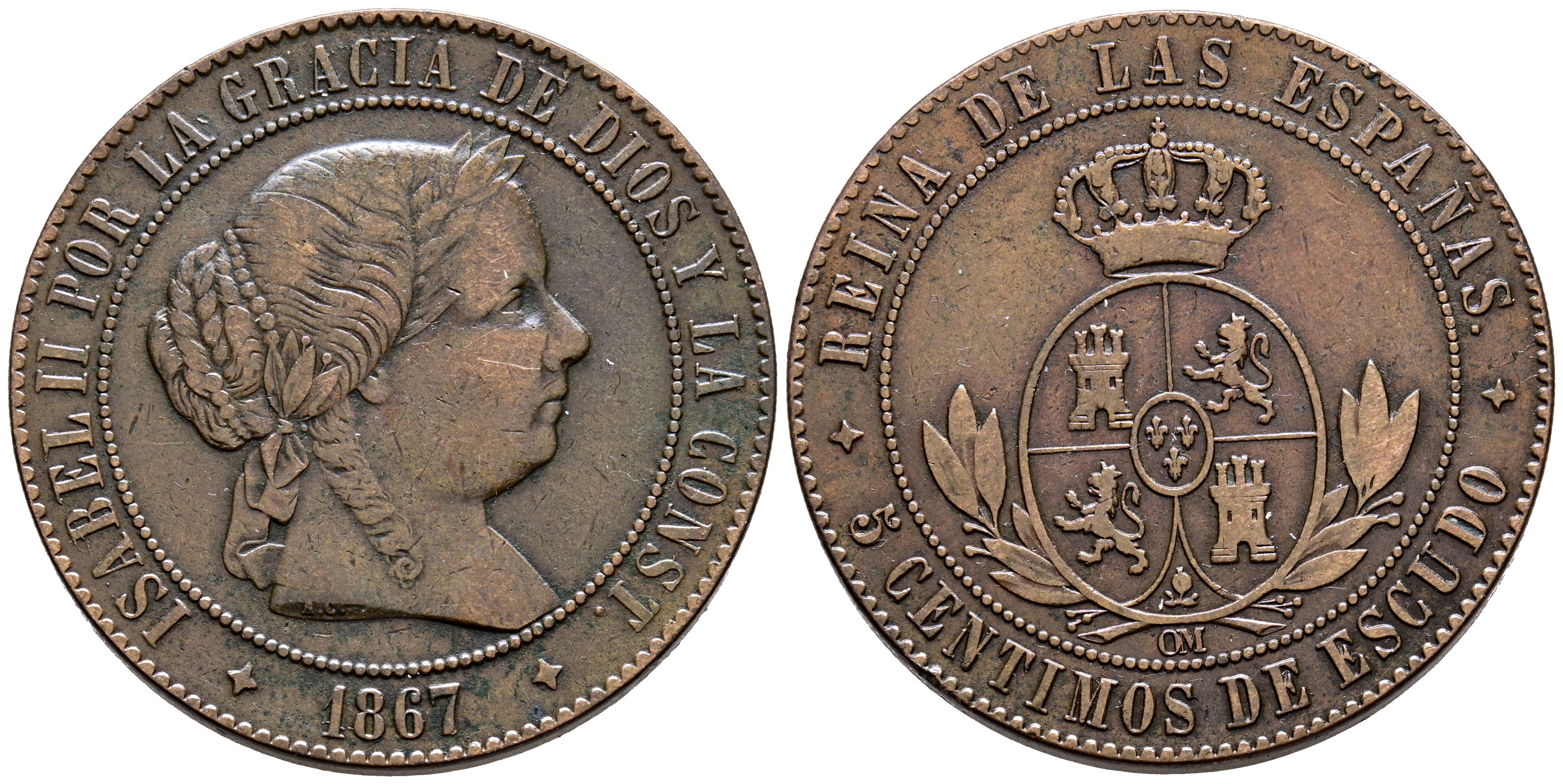 ISABEL II (1833-1868). 5 Céntimos de Escudo. (Ae. 12,35g/32mm). 1867. Jubia OM. (Cal-2019-248). MBC.