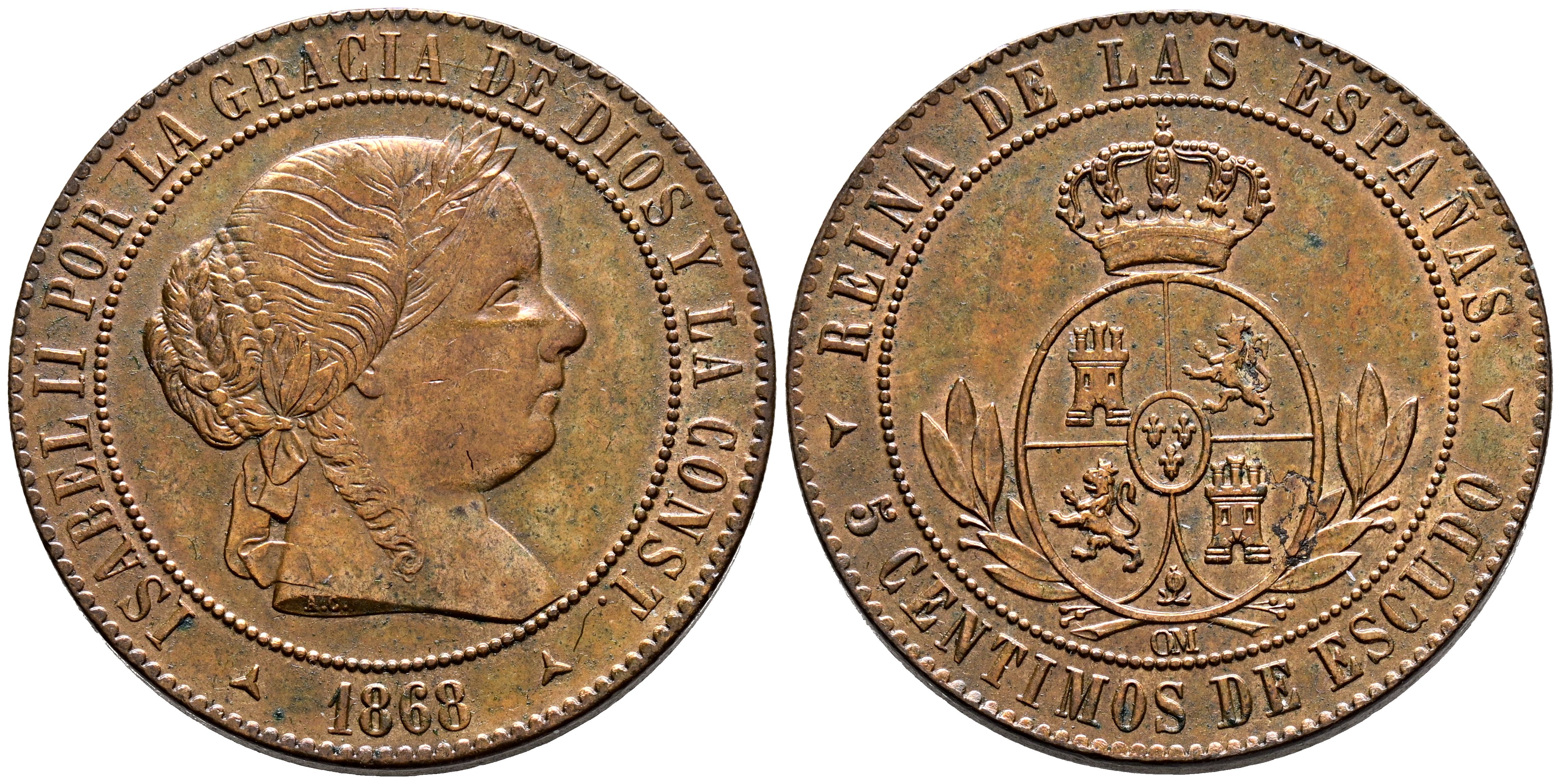 ISABEL II (1833-1868). 5 Céntimos de Escudo. (Ae. 12,18/32mm). 1868. Segovia OM. (Cal-2019-260). MBC+. Limpiada.
