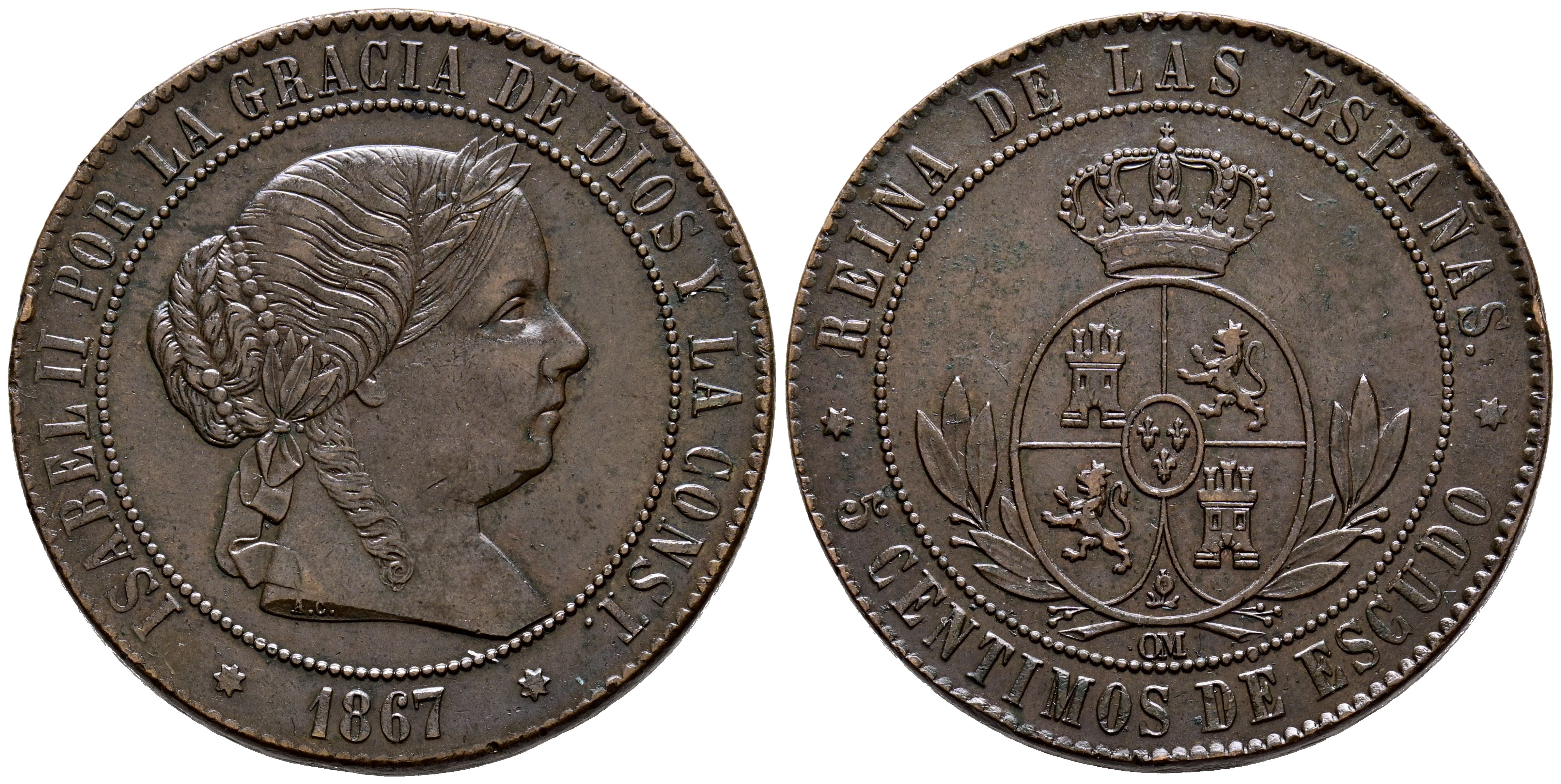 ISABEL II (1833-1868). 5 Céntimos de Escudo. (Ae. 12,26/32mm). 1867. Sevilla OM. (Cal-2019-261). MBC+. Leves golpecitos.