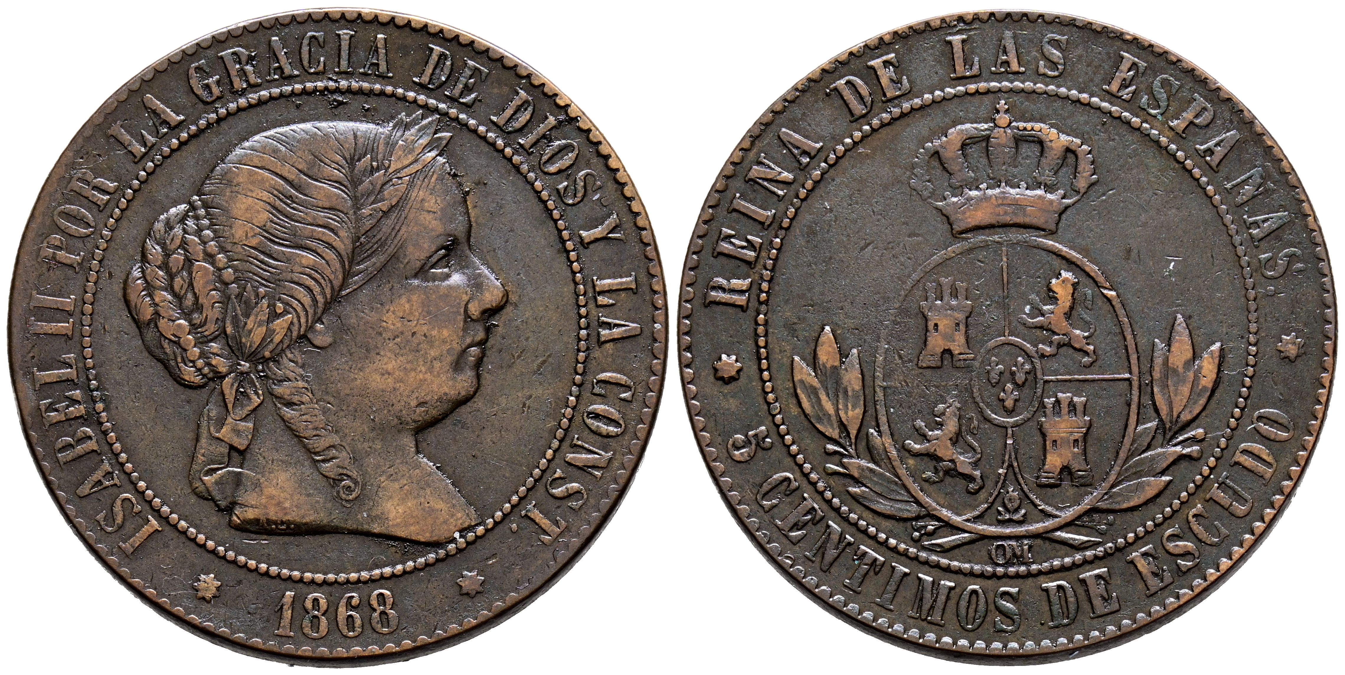ISABEL II (1833-1868). 5 Céntimos de Escudo. (Ae. 12,52/32mm). 1868. Sevilla OM. (Cal-2019-262). MBC.