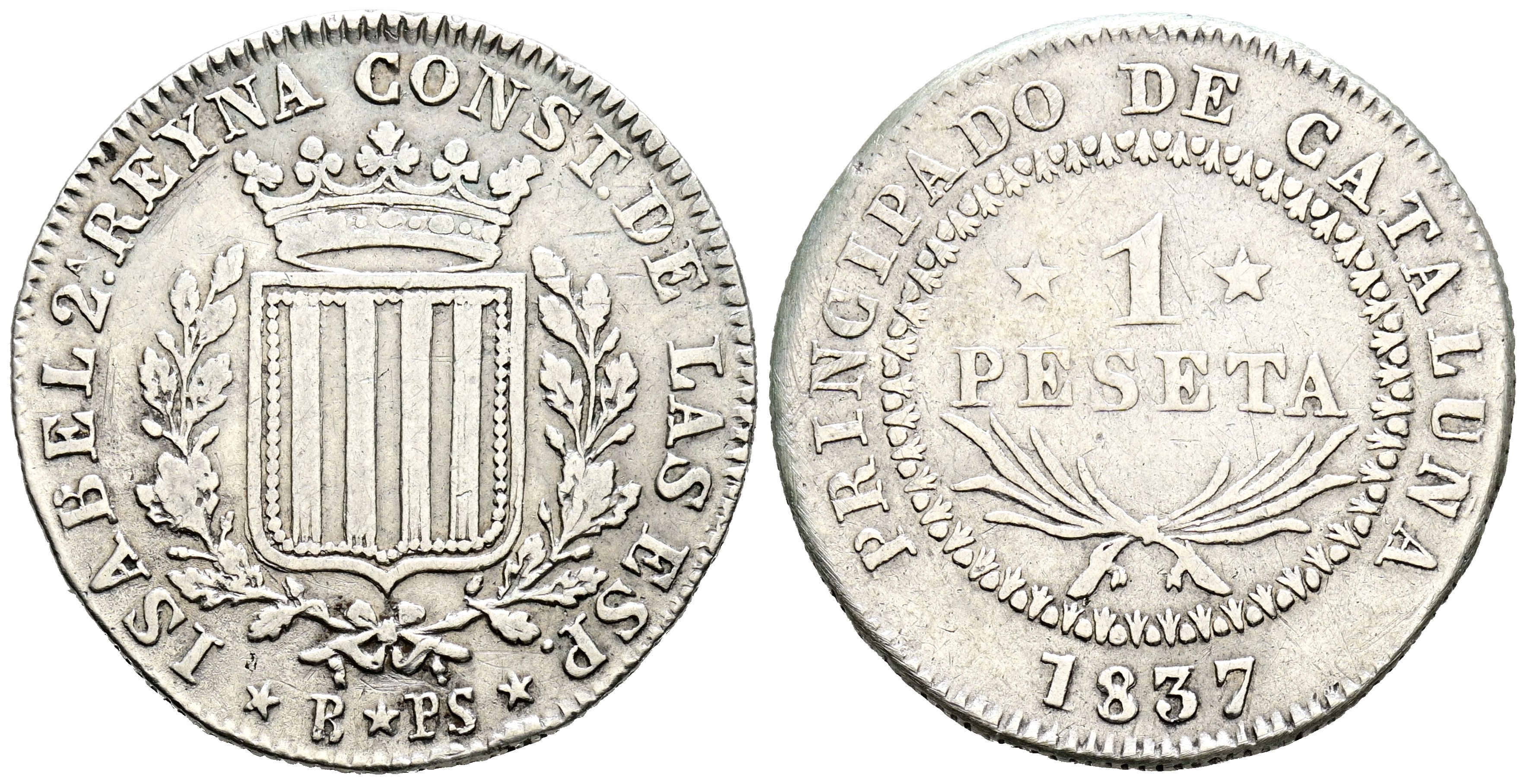 ISABEL II (1833-1868). 1 Peseta. (Ar. 5,57g/25mm). 1837. Barcelona PS. (Cal-2019-272). MBC+.