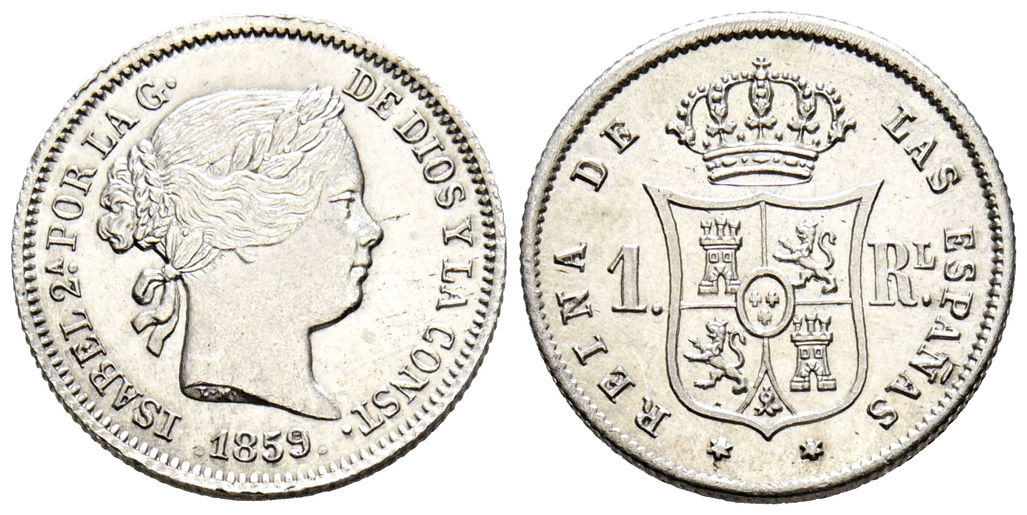 ISABEL II (1833-1868). 1 Real. (Ar. 1,29g/15mm). 1859/7. Madrid. (Cal-2019-307). EBC+. Leves rayitas. Precioso ejemplar.
