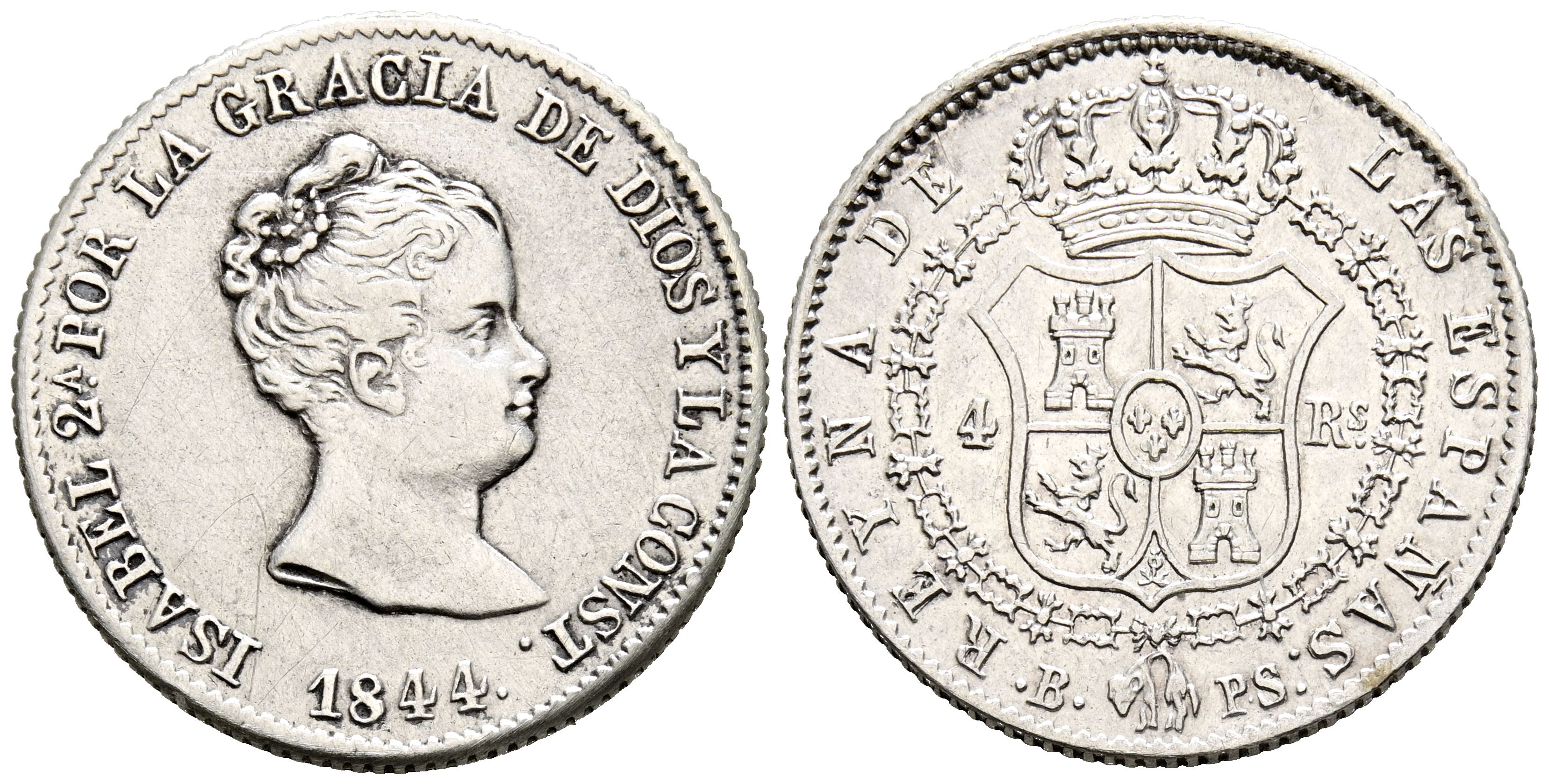 ISABEL II (1833-1868). 4 Reales. (Ar. 5,83g/23mm). 1844. Barcelona PS. (Cal-2019-418). MBC+/EBC-. Escasa.