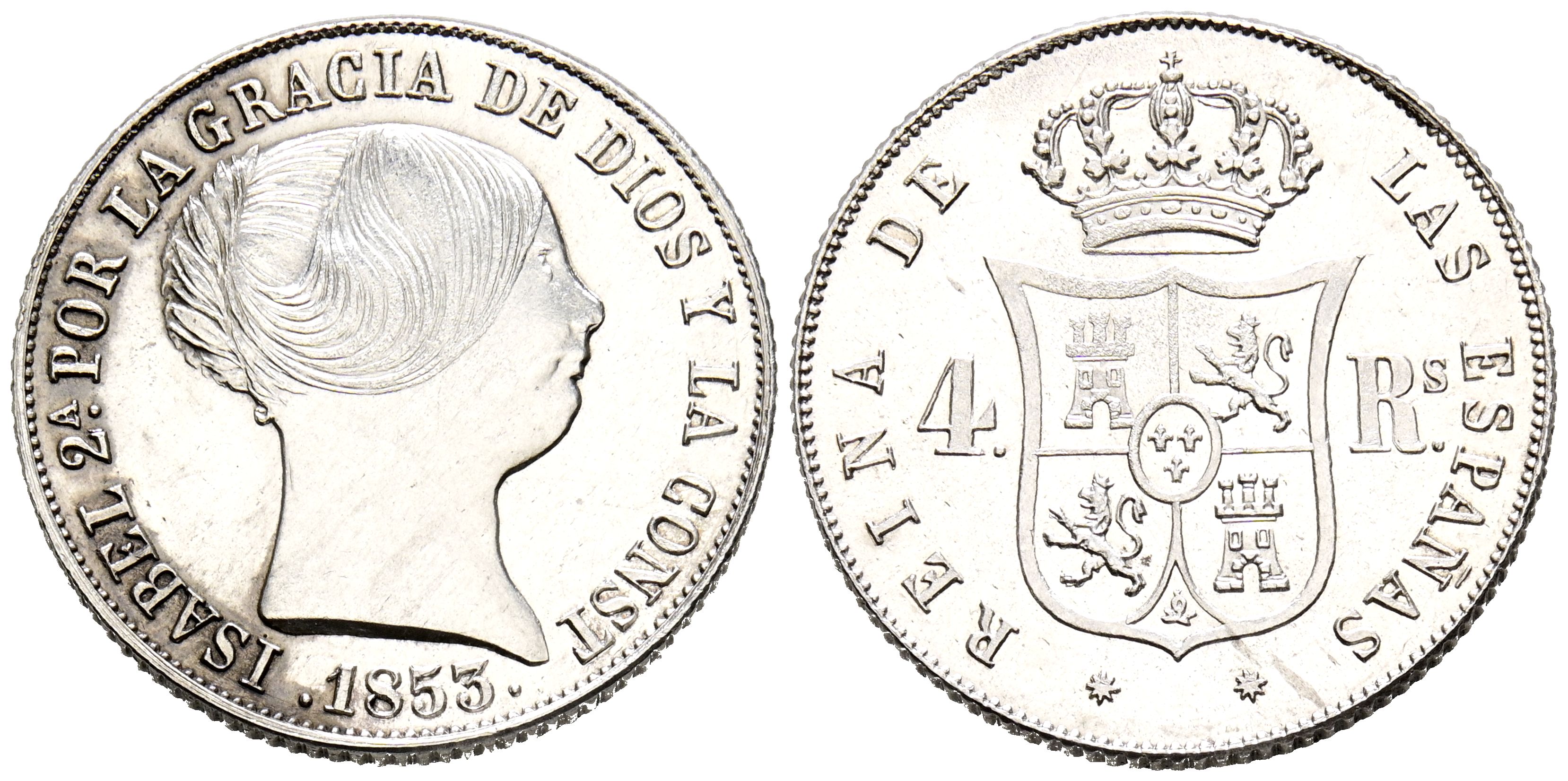 ISABEL II (1833-1868). 4 Reales. (Ar. 5,29g/23mm). 1853. Barcelona. (Cal-2019-426). SC-. Rayitas. Extraordinario ejemplar, muy raro así, manteniendo su pleno brillo original.