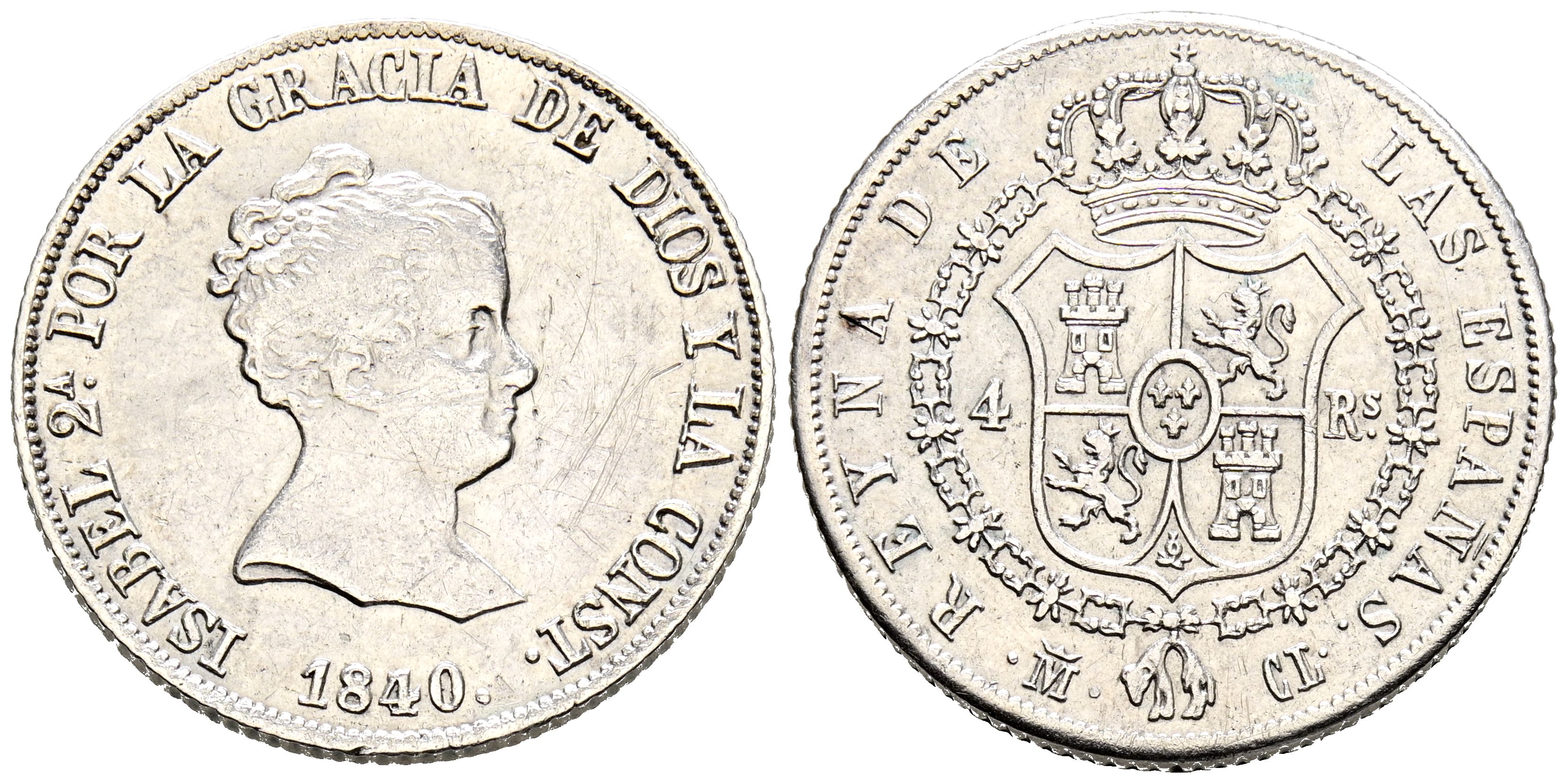 ISABEL II (1833-1868). 4 Reales. (Ar. 5,70g/23mm). 1840. Madrid CL. (Cal-2019-448). MBC+/EBC-. Rayitas principalmente en anverso. Muy rara.