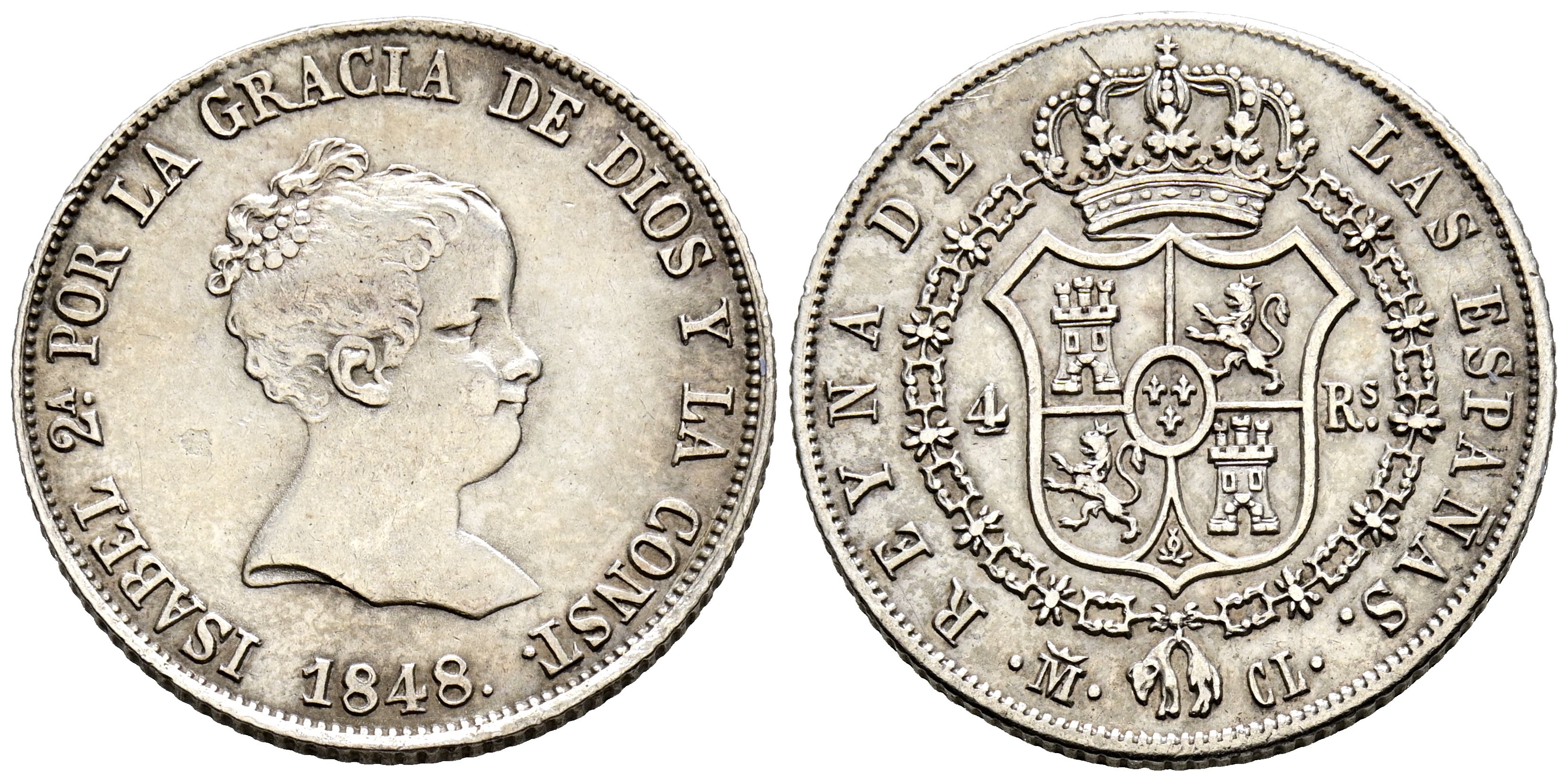 ISABEL II (1833-1868). 4 Reales. (Ar. 5,23g/23mm). 1848. Madrid CL. (Cal-2019-453). MBC+. Pátina.