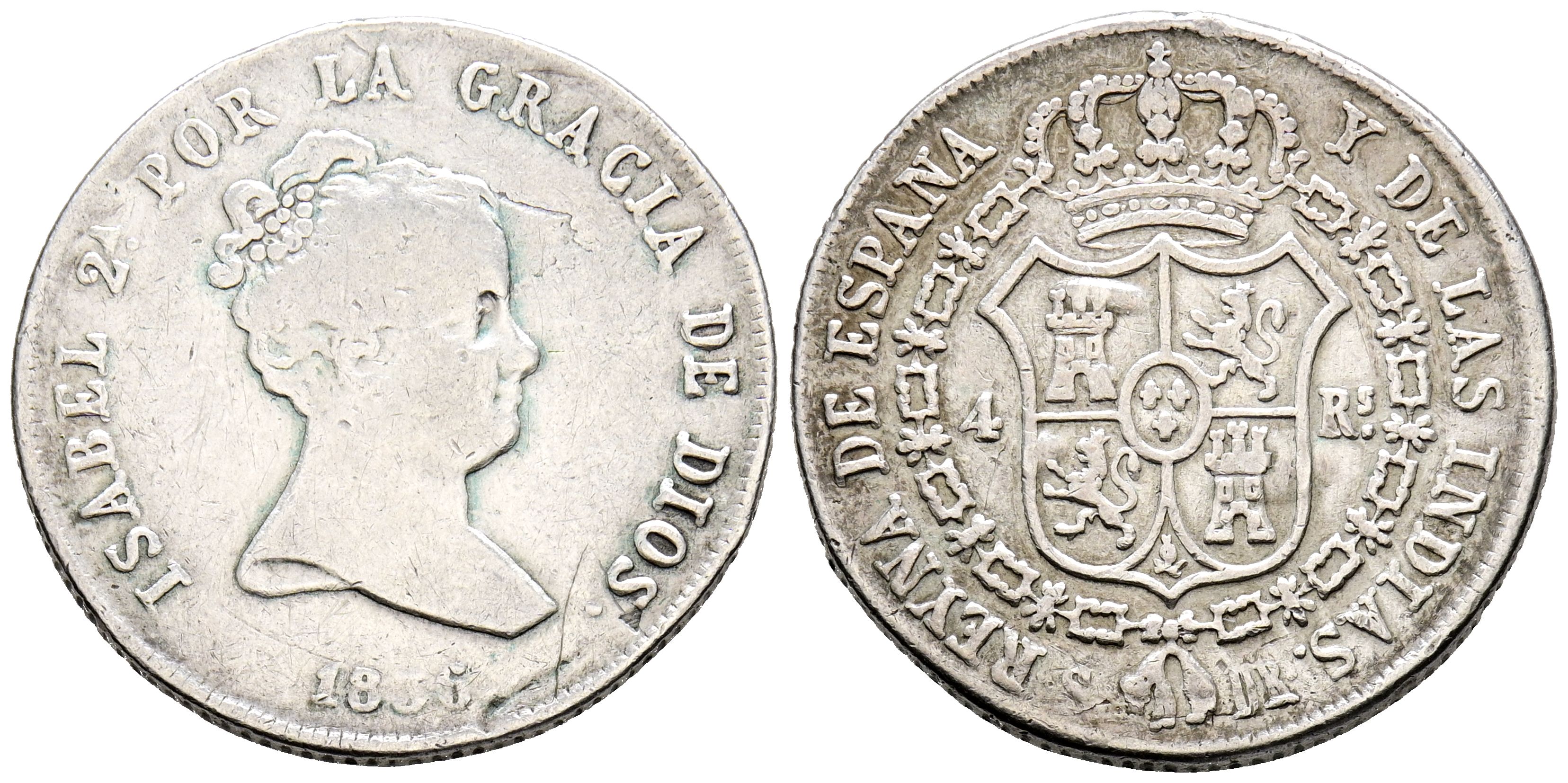ISABEL II (1833-1868). 4 Reales. (Ar. 5,77g/23mm). 1836. Sevilla DR. (Cal-2019-471). "DIOS" en la leyenda del anverso. BC+. Muy escasa.