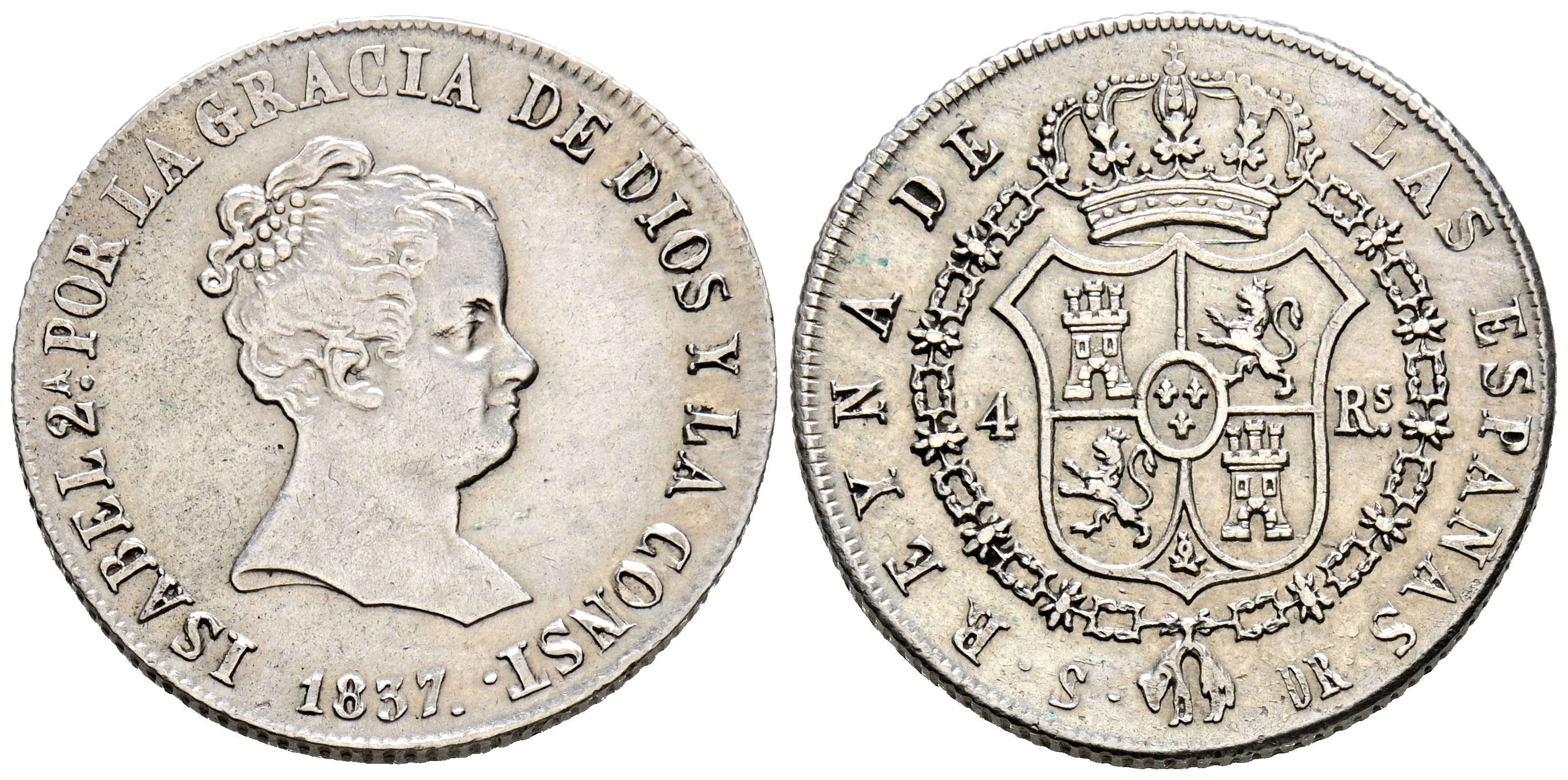 ISABEL II (1833-1868). 4 Reales. (Ar. 5,97g/23mm). 1837. Sevilla DR. (Cal-2019-472). MBC+. Bonito tono. Escasa.