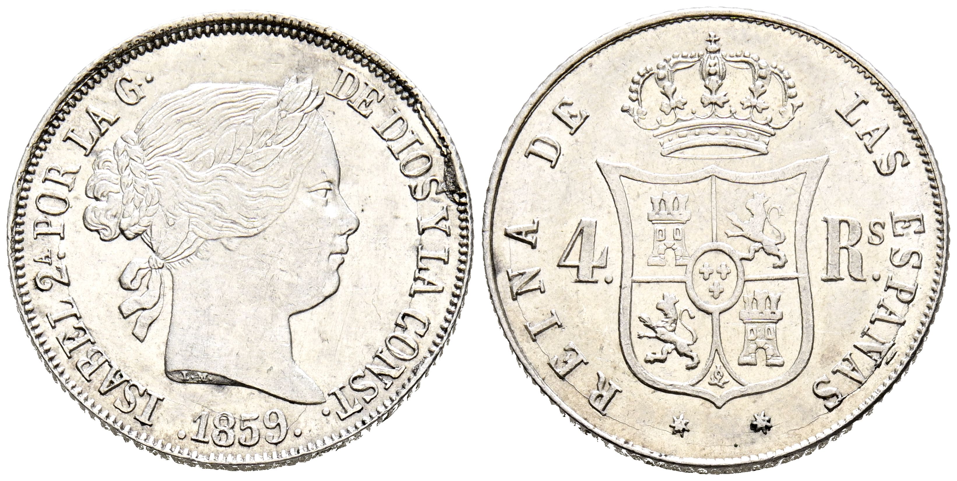 ISABEL II (1833-1868). 4 Reales. (Ar. 5,17g/23mm). 1859. Sevilla. (Cal-2019-492). EBC. Restos de brillo original. Exceso de metal en grafila. Escasa y más así.