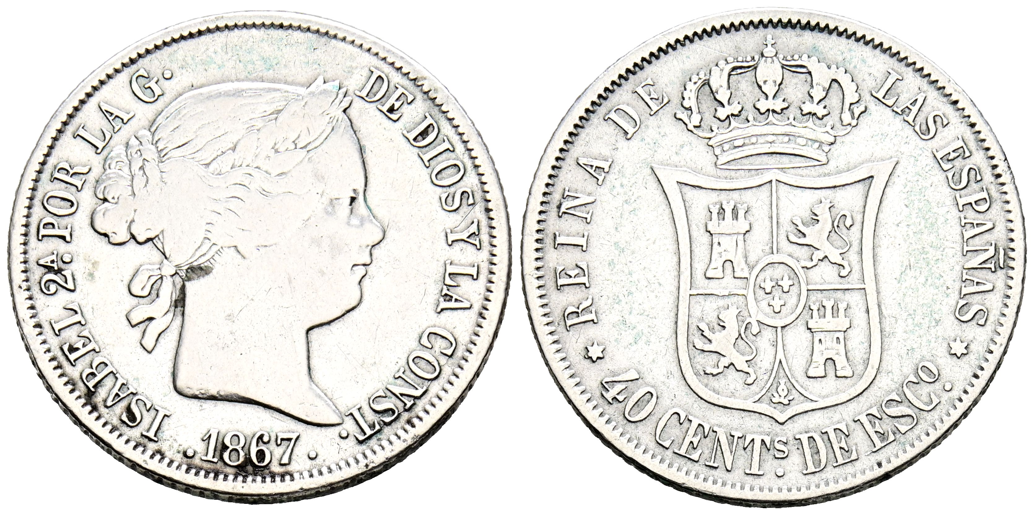 ISABEL II (1833-1868). 40 Céntimos de Escudo. (Ar. 5,07g/23mm). 1867. Madrid. (Cal-2019-502). MBC-/MBC.