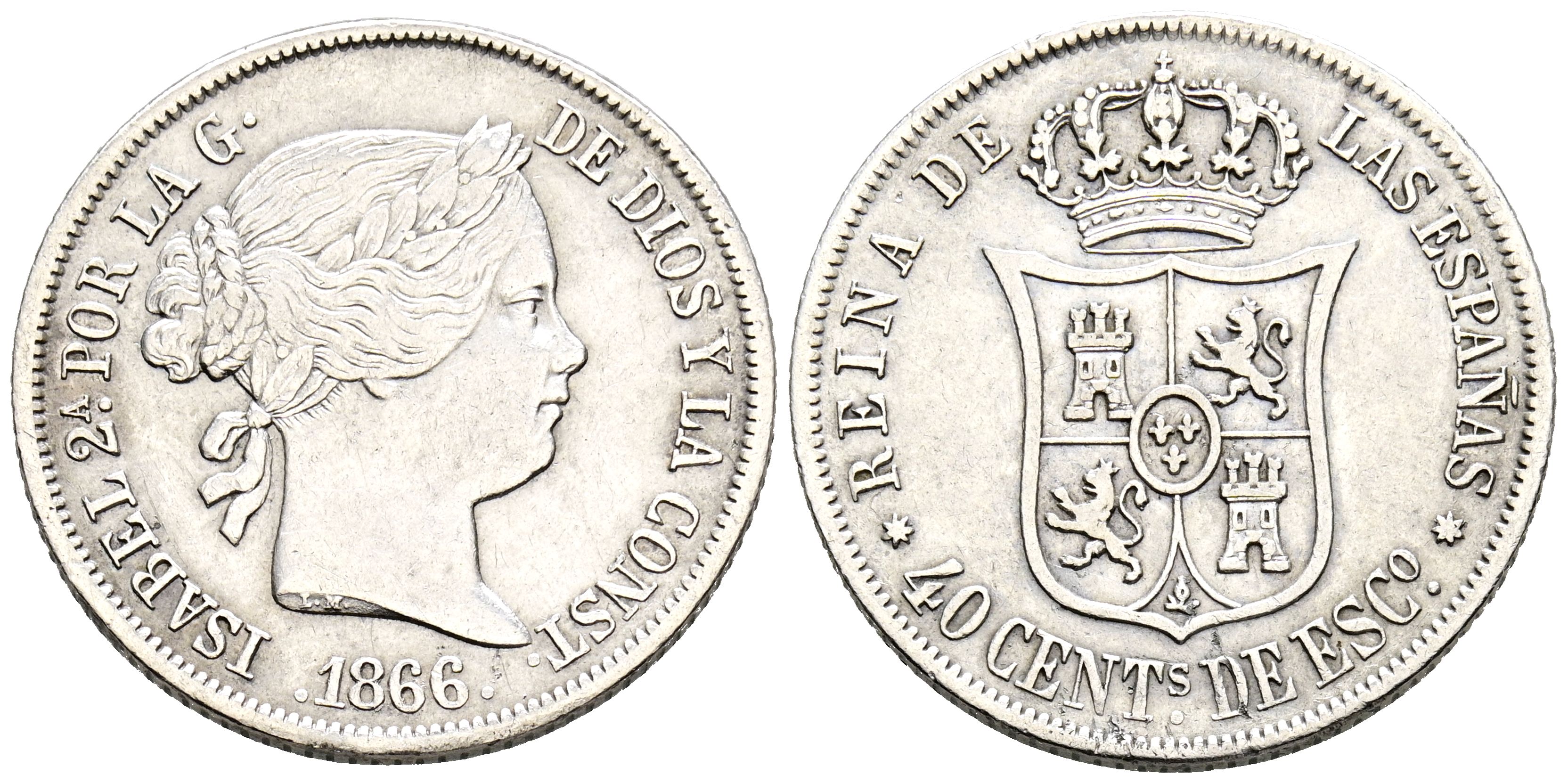 ISABEL II (1833-1868). 40 Céntimos de Escudo. (Ar. 5,19g/23mm). 1866. Sevilla. (Cal-2019-505). MBC+. Escasa.