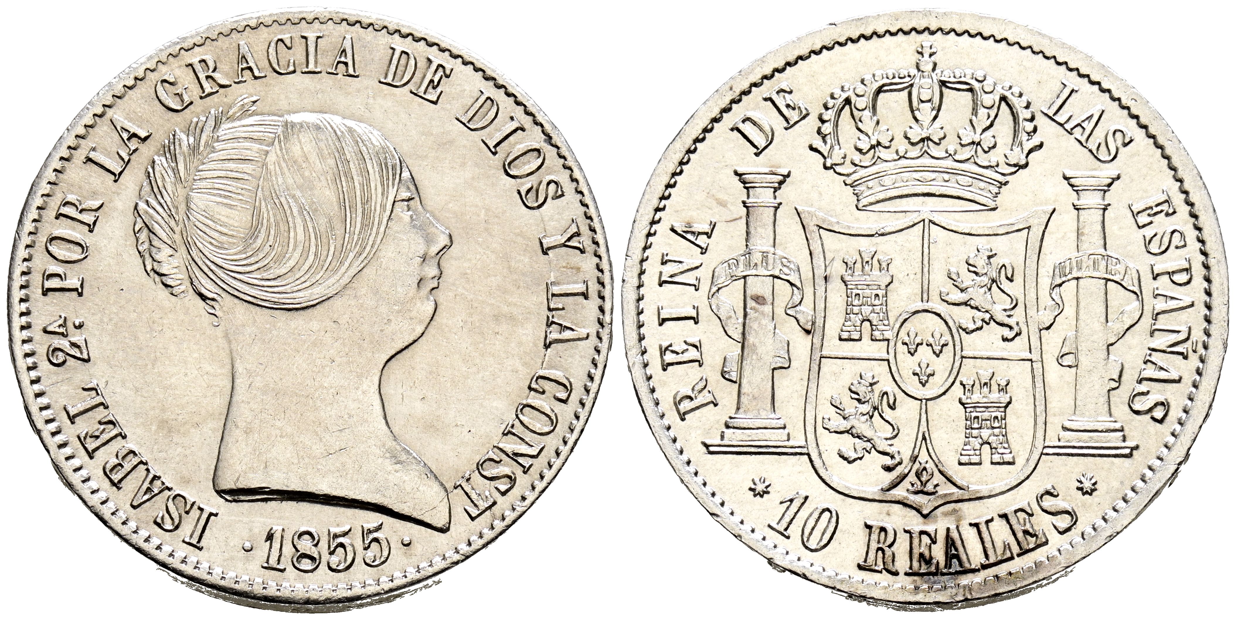 ISABEL II (1833-1868). 10 Reales. (Ar. 12,87g/29mm). 1855. Sevilla. (Cal-2019-552). EBC+. Leves rayitas. Escasa y más así.