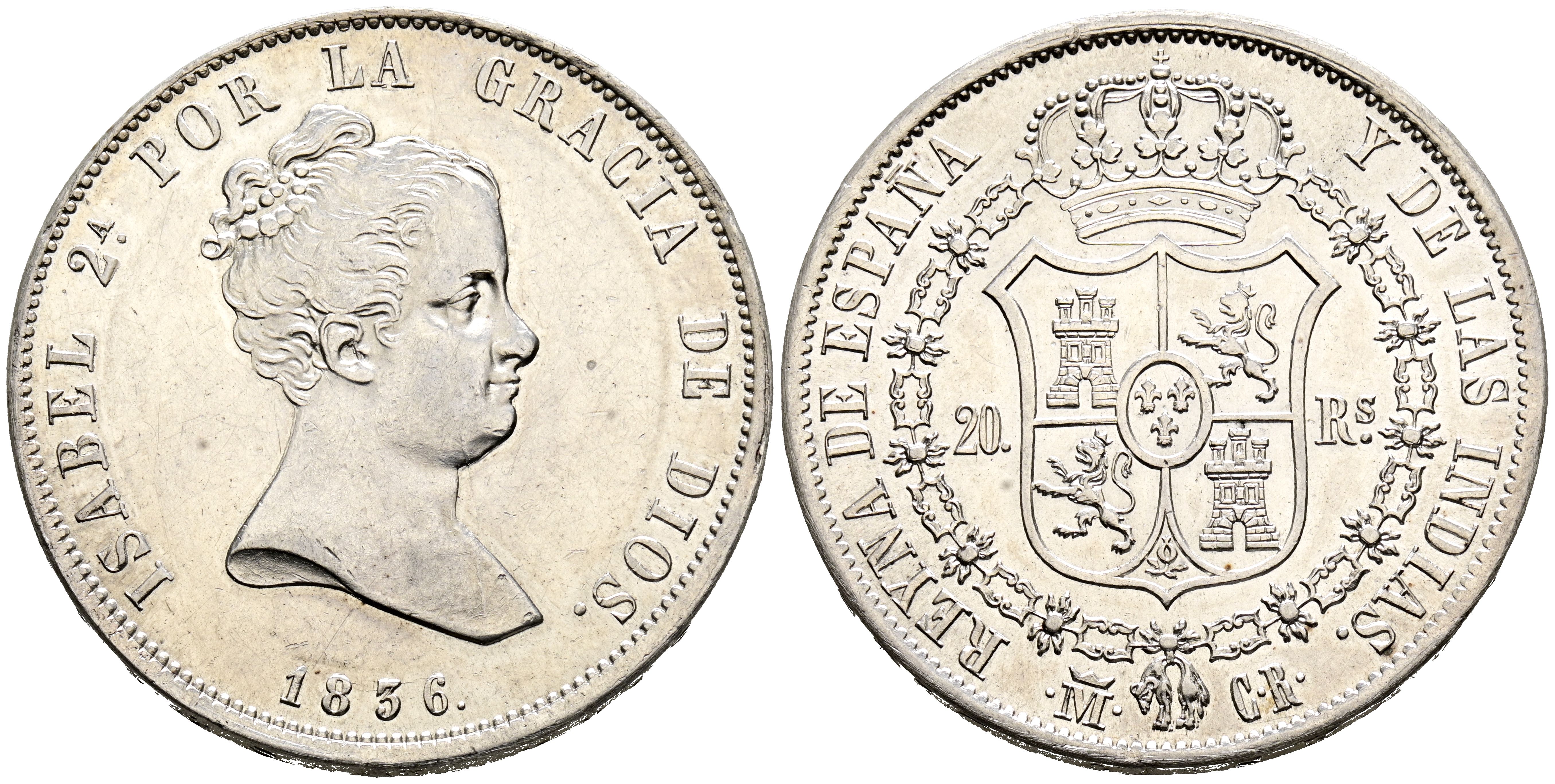 ISABEL II (1833-1868). 20 Reales (Ar. 26,92g/38mm). 1836. Madrid CR. (Cal-2019-580). "Dios" en la leyenda del anverso. EBC+. Leves rayitas. Restos de brillo original. Excepcional ejemplar. Escasa en esta magnífica calidad.
