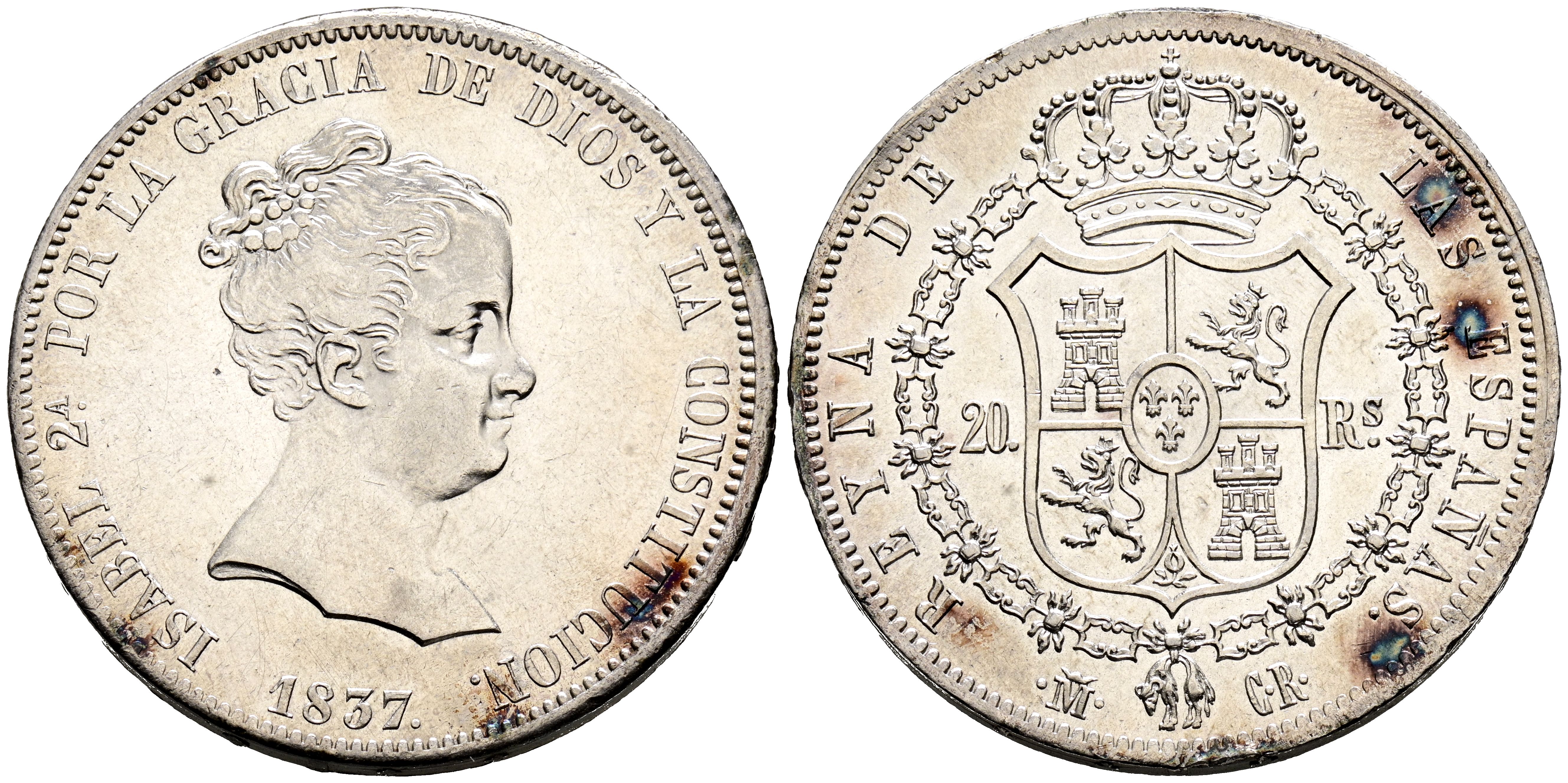 ISABEL II (1833-1868). 20 Reales (Ar. 26,98g/37mm). 1837. Madrid CR. (Cal-2019-581). "CONSTITUCIÓN" en la leyenda del anverso. EBC+. Leves rayitas y algún levísimo golpecito. Restos de brillo original. Excepcional ejemplar. Escasa así.