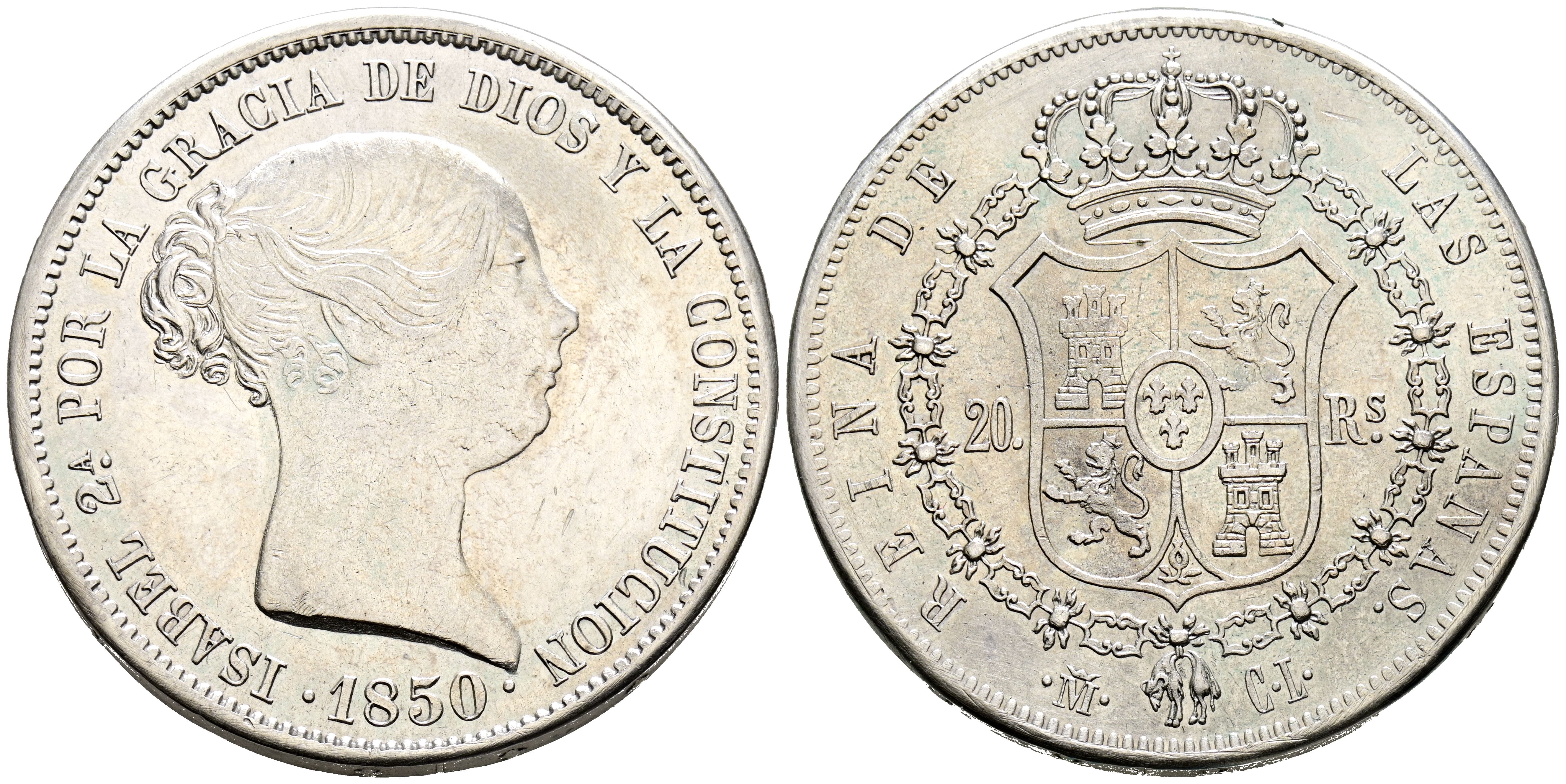 ISABEL II (1833-18368). 20 Reales. (Ar. 25,96g/37mm). 1850. Madrid CL. (Cal-2019-592). MBC+.