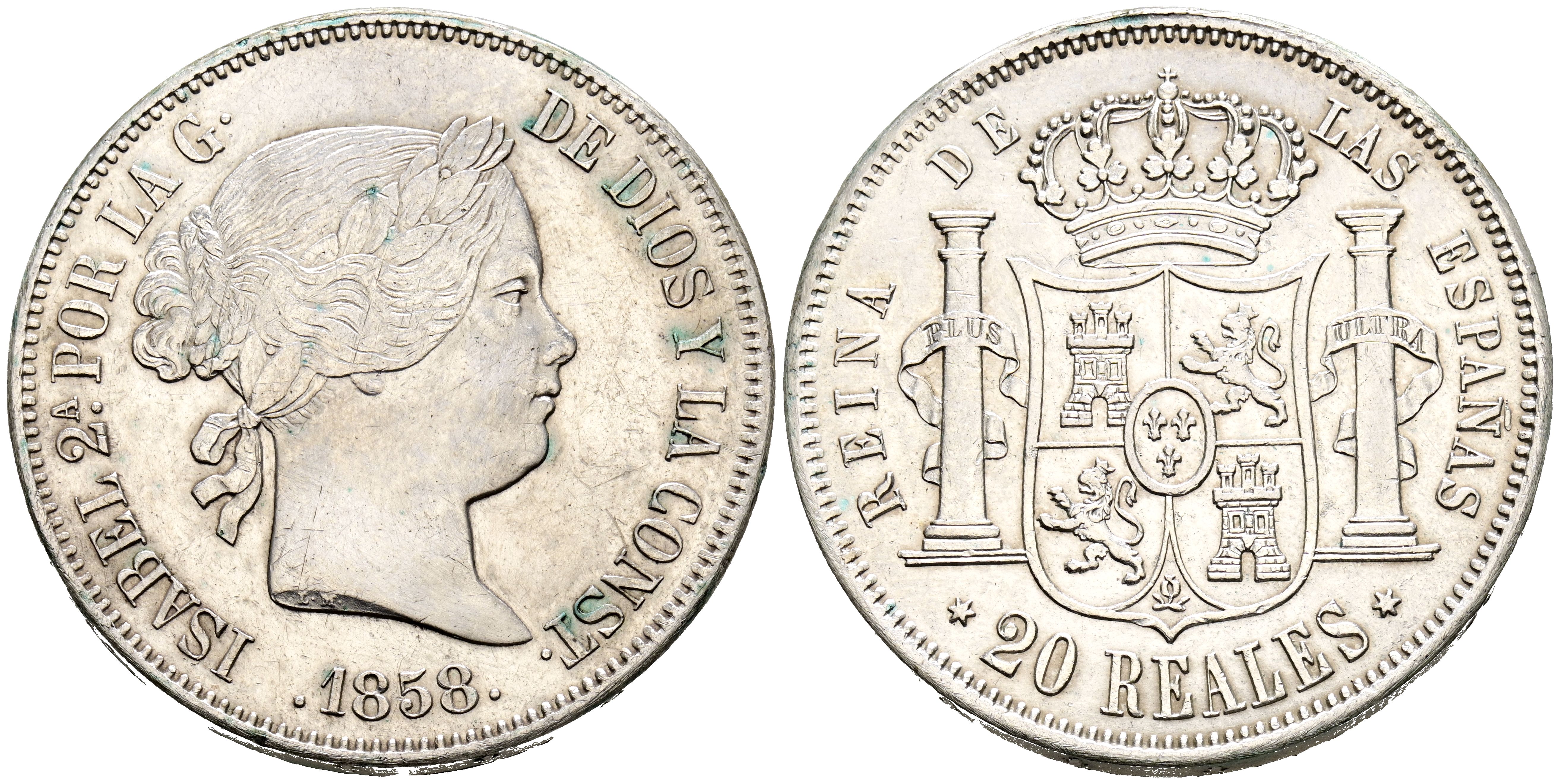ISABEL II (1833-18368). 20 Reales. (Ar. 25,87g/37mm). 1858. Madrid. (Cal-2019-615). EBC-. Rayitas.